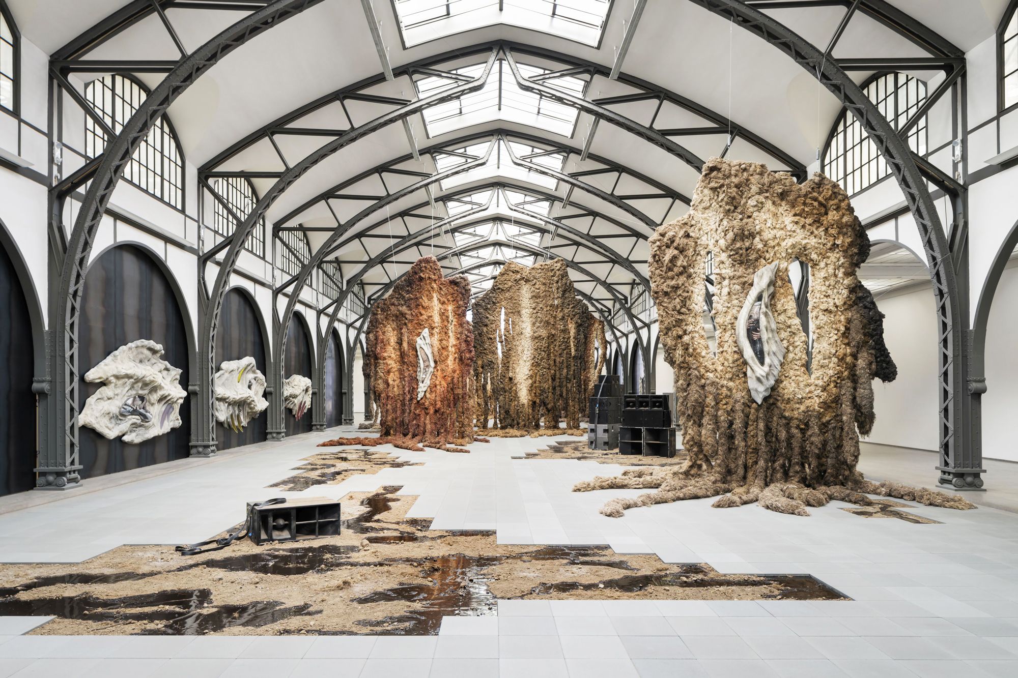 Her toast is to Czech artist Klára Hosnedlová (*1990), whose “embrace” has hung from the vaulted iron girders – at what Peel calls “epic scale” – showers of thickly dreaded fabrics, dyed beige and rust and moss, that plait into six upright, broad-shouldered titans. Part human, part monster, part phantom, these sentinels seem to float despite their weight, dozens of descending appendages coiling and unspooling over the re-slabbed floor. Here and there across the concrete spread puddles of water (clear epoxy) and scuzzes of dirt, as though the forest guardians – Tolkien’s ents, maybe, or the Slavic god Leshi – has pulled down the former train station’s skylighted roof. Sculpturizing the garden flora and woodland fauna depicted in so much folk weaving, Hosnedlová’s tapestries now stand watch.