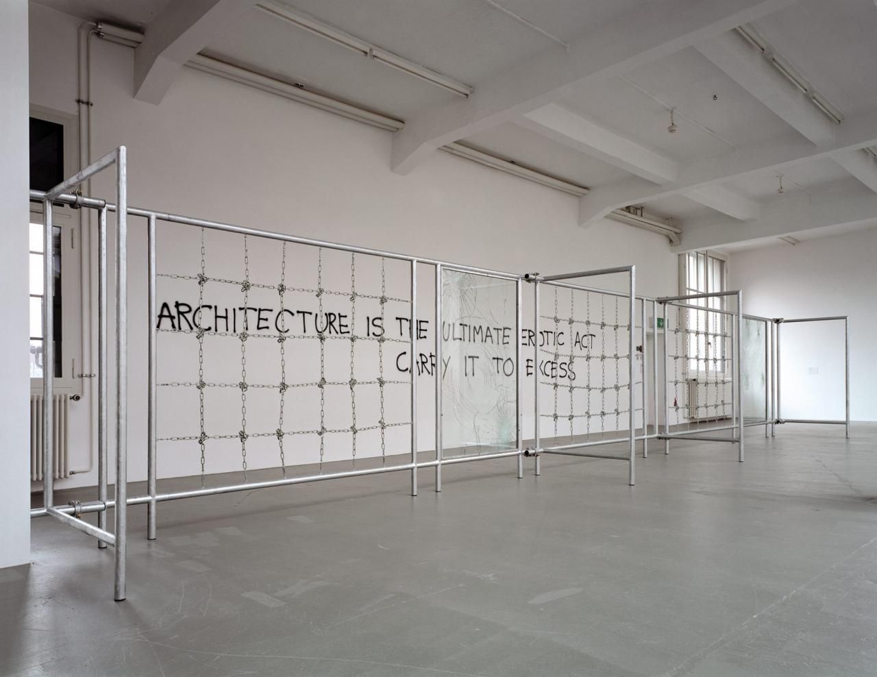 Yes and no. Every space has a character that makes each person react in a different way. I am sensitive about the way spaces create these kinds of reactions. Everyone can make the associations they can make … For me, sexuality is a way to express ironically and recklessly what I want to say about issues that I might not be able to talk about in another way. There is something basic, and still very complex, in sexuality that I found in architecture, too. Wallfuckin’ or The Fetishism of Commodities (2002), are installations that deal with sexuality, yet they do so with an “I don’t give a fuck” attitude towards big structures like theory and architecture. With its metal, chains and leather, The Fetishism of Commodities confronts Marx’s ideas about labor with architects’ fetishism for pure materials and an S&M sexuality, which is about power relations. Since you mentioned Freud, everybody has a sexual drive; sexuality is with you all the time, however it is expressed. That said, I don’t want to put buildings on a couch. Along with reading, I analyze a work to decide what is more important and what is not as an art work. But if you deal with sculpture and large-scale installation, then you have to relate to the body first, and sexuality is part of it.