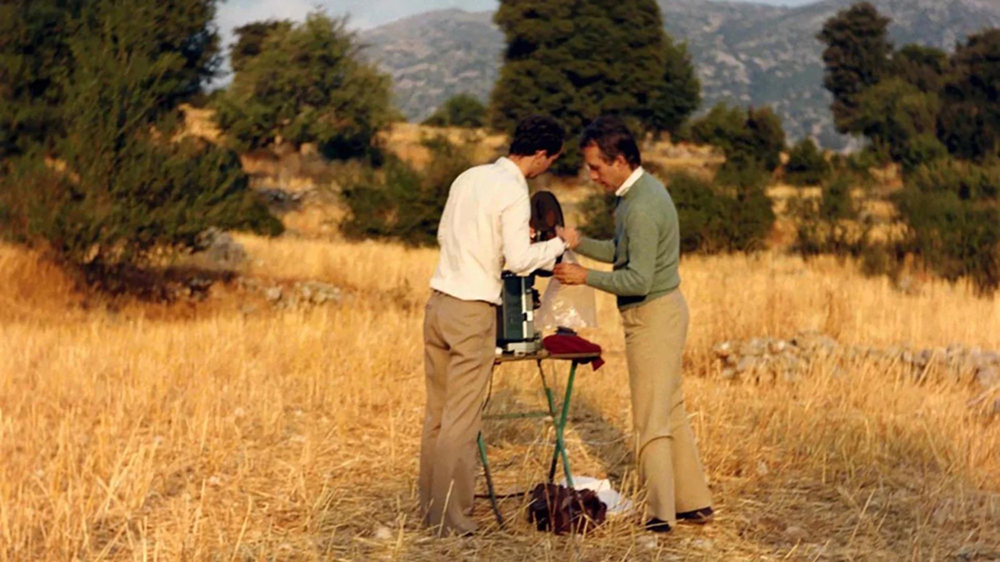 Over the ensuing years, Markopoulos developed an increasingly enigmatic cosmology surrounding his Temenos project. He took copious unpublished notes – some sixty-five volumes he catalogued and stored in a bank vault in Switzerland – in which he gnomically referred to himself as a “filmmaker physician,” dedicated to restoring the lost preeminence of “film as film.” It wasn’t until the 1980s that he located his ideal site, a small clearing outside a Peloponnesian village called Lyssaraia where his father had grown up. Markopoulos’s choice framed the Temenos as a sort of cinematic Bayreuth in his ancestral backyard, and he’d spend the rest of his life preparing the Gesamtkunstwerk he intended to show there, a magnum opus called Eniaios, composed largely of brief shots repurposed from earlier works, interwoven with blank stretches of black and white film leader. It took over a decade of painstaking labor to assemble the film, as Markopoulos glued by hand the upward of twenty thousand cement splices that structure it. When he died of lymphoma in 1992, he’d just barely finished Eniaios, a 167-reel behemoth that would take eighty hours to screen in its entirety. Because he cut it using original camera negatives, he never saw it projected before he died.