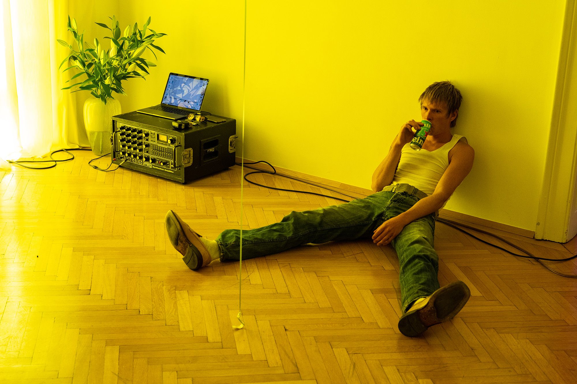 Audience involvement – a key aspect of comedy – seems to have been part of Esben Weile Kjær’s “HARDCORE FREEDOM” show at Zeller van Almsick. A two-day party performance transformed the gallery into a mix between nightclub, art space, and living room. Seven people must have danced and drank, celebrating youth and freedom (and destroying the space in the process). After the opening weekend, what remains are the leftovers of their controlled escapade, silver cubic balloons still hanging from the ceiling, the huge loudspeakers, the empty champagne bottles and half-burned sticks of sage. The melancholic air that this setting emanates is intentional: after excess comes depression.