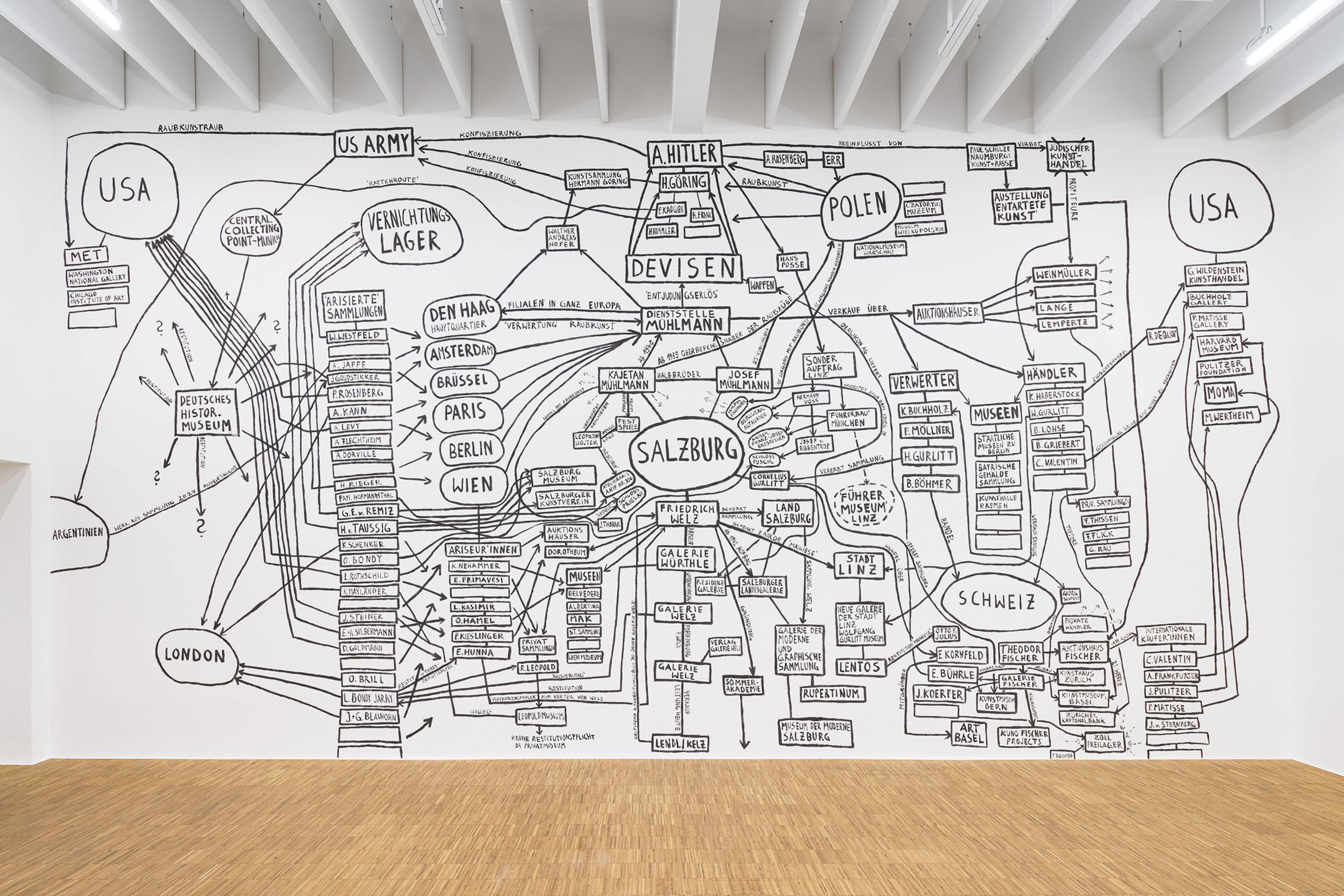 Zooming back out, Thomas Geiger has produced A Cartography of Theft, a “sociogram” of people, institutions, cities, and countries: victims, perpetrators, and recipients of Nazi plunder. Black letters and lines cover an entire wall of the gallery. Right at the top, there’s “A. Hitler,” Führer and failed artist, who had planned to build an art museum in Linz for the best of the works looted by the Nazis. This is not the only place his name appears in the exhibition. On Thun’s metal shelves, sharp-eyed viewers will notice a sticky note labelled “Hitler’s Executive”: When Thun visited the stores of the Salzburg Museum, which had recently staged an exhibition on the Austrian police under Nazi rule, one of its exhibits, a gun, was being kept on the same shelves as the objects awaiting physical restitution. As well as other familiar names – including Taussig and the Salzburg Museum – Geiger’s map contains a number of empty boxes and question marks. “Your great-grandfather should be on there,” someone told me, among so many lesser-known people and places.
