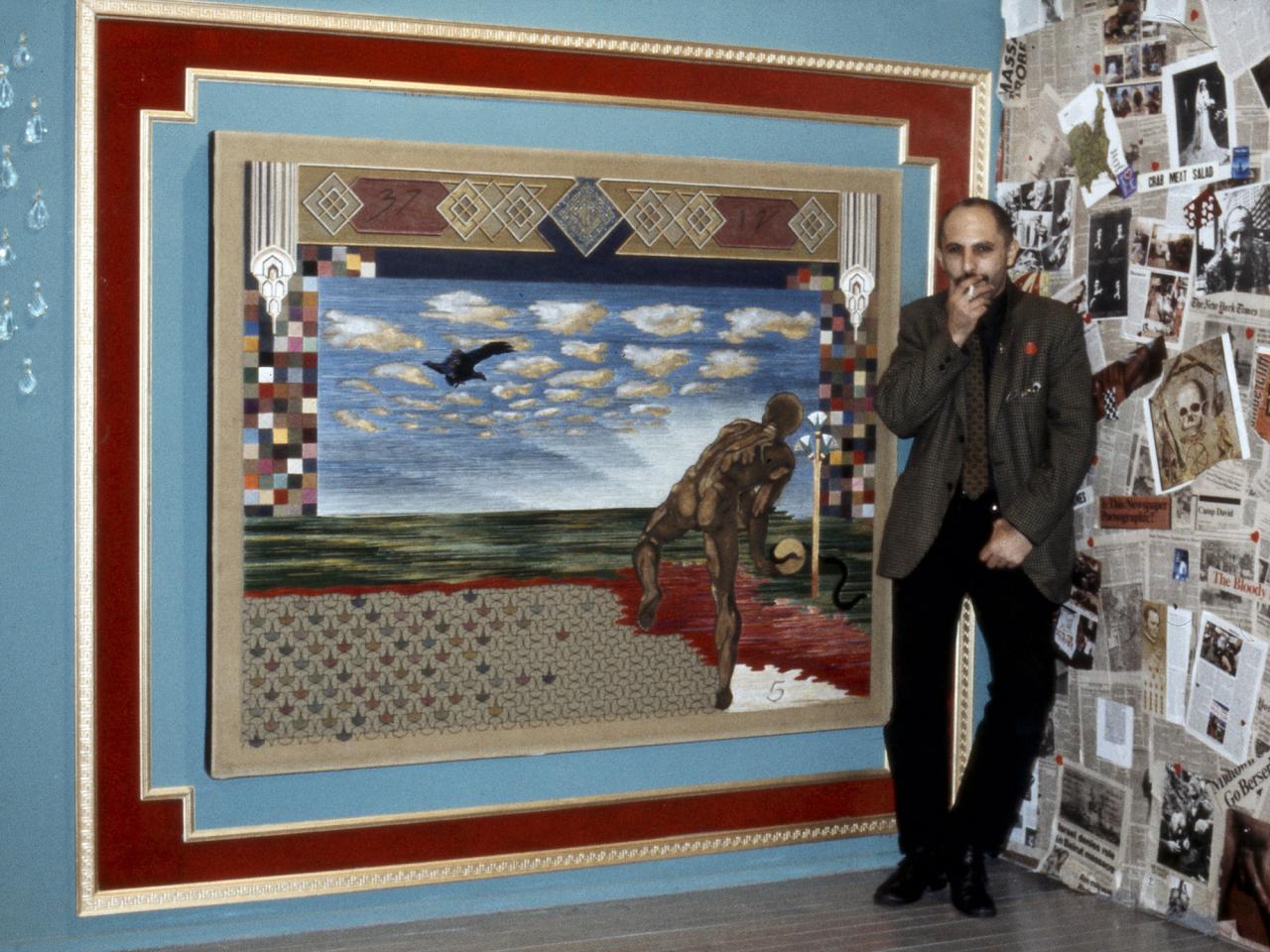 Moufarrege’s sparse retrospective at CCA Berlin, which is curated by Bidoun editor-in-chief Negar Azimi and CCA’s Edwin Nasr and shares a title, “The Mutant International,” with a series of essays the artist published in Art Magazine in 1983, culls an assortment of portrait drawings from the early 1970s alongside larger embroidered works from the artist’s time in New York, where he lived from 1981 until his death. In the first of several of Moufarrege’s eponymous essays, he divulges with the grandeur of history that he left Beirut on 22 November, the anniversary of both Lebanon’s Independence Day and the assassination of John F. Kennedy. The year he left, he made a needlepoint painting titled Le sang du phenix (The Blood of the Phoenix, 1975) upon arriving in Paris. If a certain brand of Lebanese nationalism had taken the phoenix’s rebirth as its crowning mea culpa after chronic tragedy, Moufarrege found the pompous pheasant’s bodily fluid splattered at the base of an Ionic column and committed it to canvas, gilding it in crimson alongside a botched cedar and a mutilated but still raised fist.