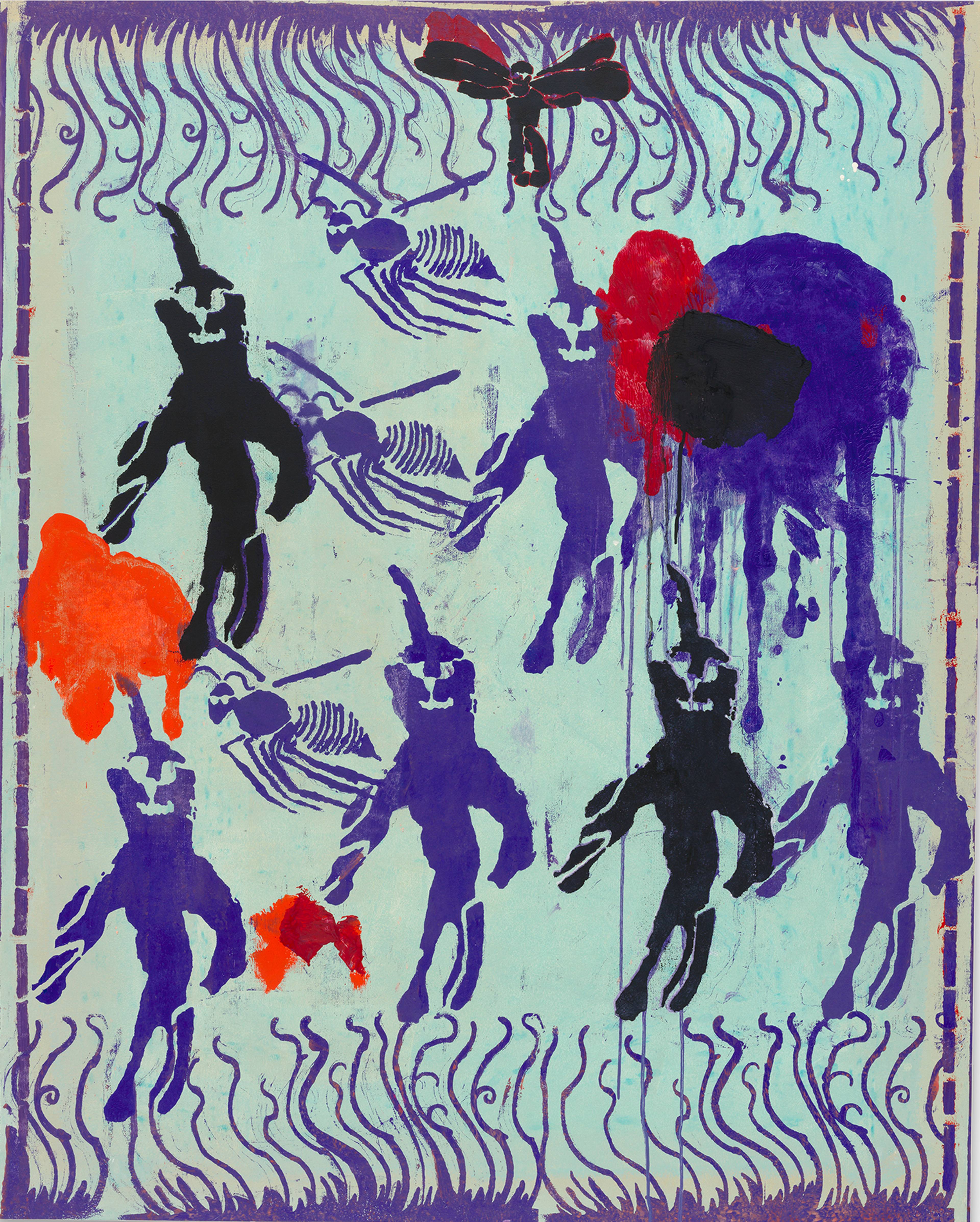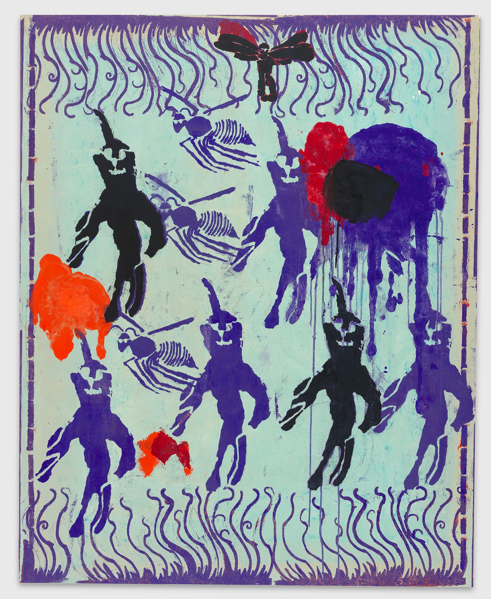 JS: No, I’ve done that before. I cut out all these bat stencils for a big, eight- or nine-meter painting of the grim reaper I did on the wall of the new Supreme store in Shanghai, for example, and I used them on these paintings here. It’s something I’ve been wanting to try out more, because the stencils don’t convey the emotion of regular painting.