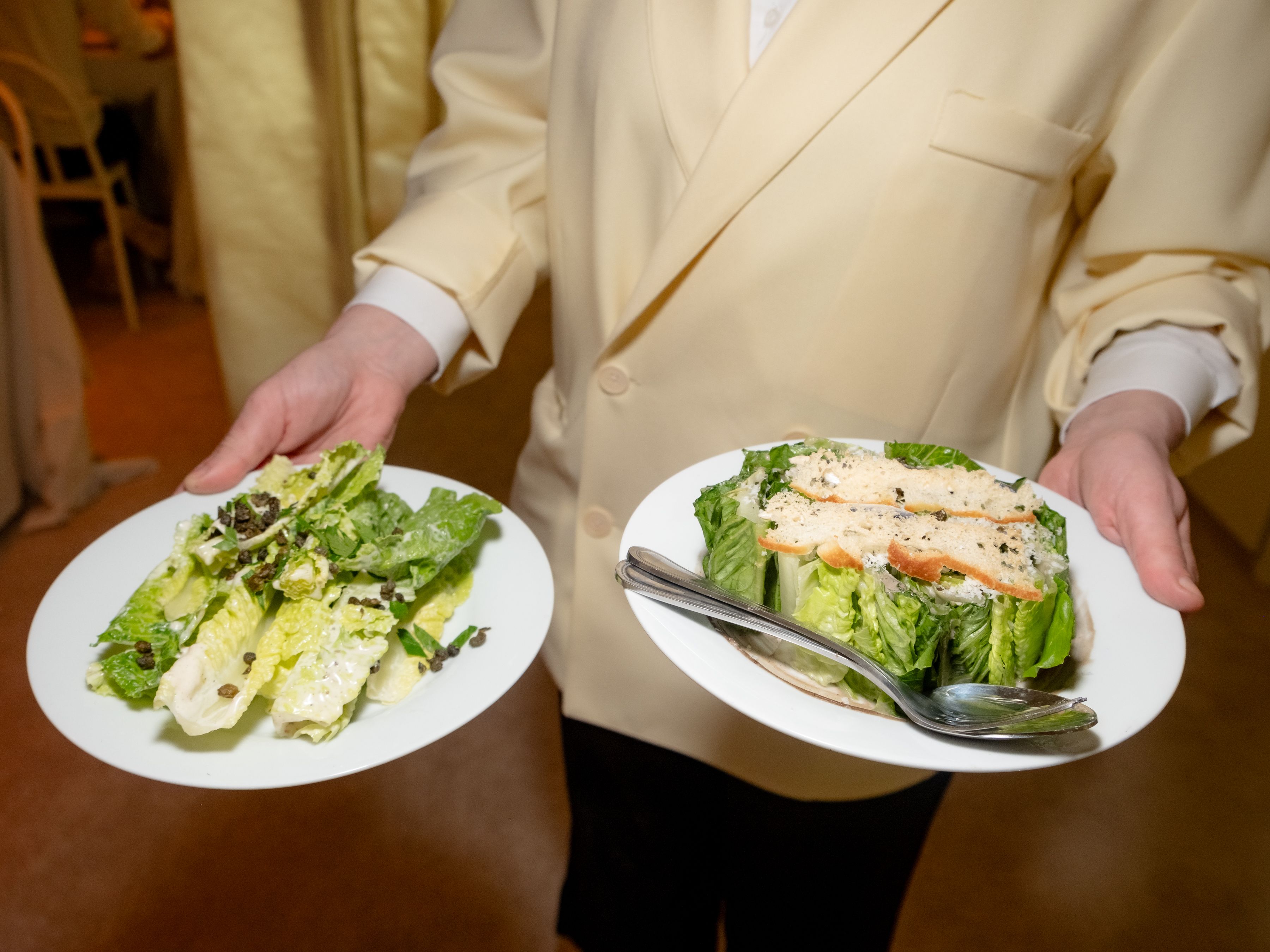 I had such a great time, actually, that I went back for lunch. (The kitchen, inherited from a previous tenant, will continue to serve limited prix fixe meals and teatime à la carte until the show closes in mid-December.) On a Friday afternoon, unannounced and on my own meager dime, I could focus on the pop-up’s namesake dish: the Black Caesar, a salad of romaine painted with black-garlic dressing and garnished with white anchovies and croutons (“shaved bread”). The sticky, fermented allium put subtle funk on a classic. The romaine, cut crosswise, had space to stretch its legs.