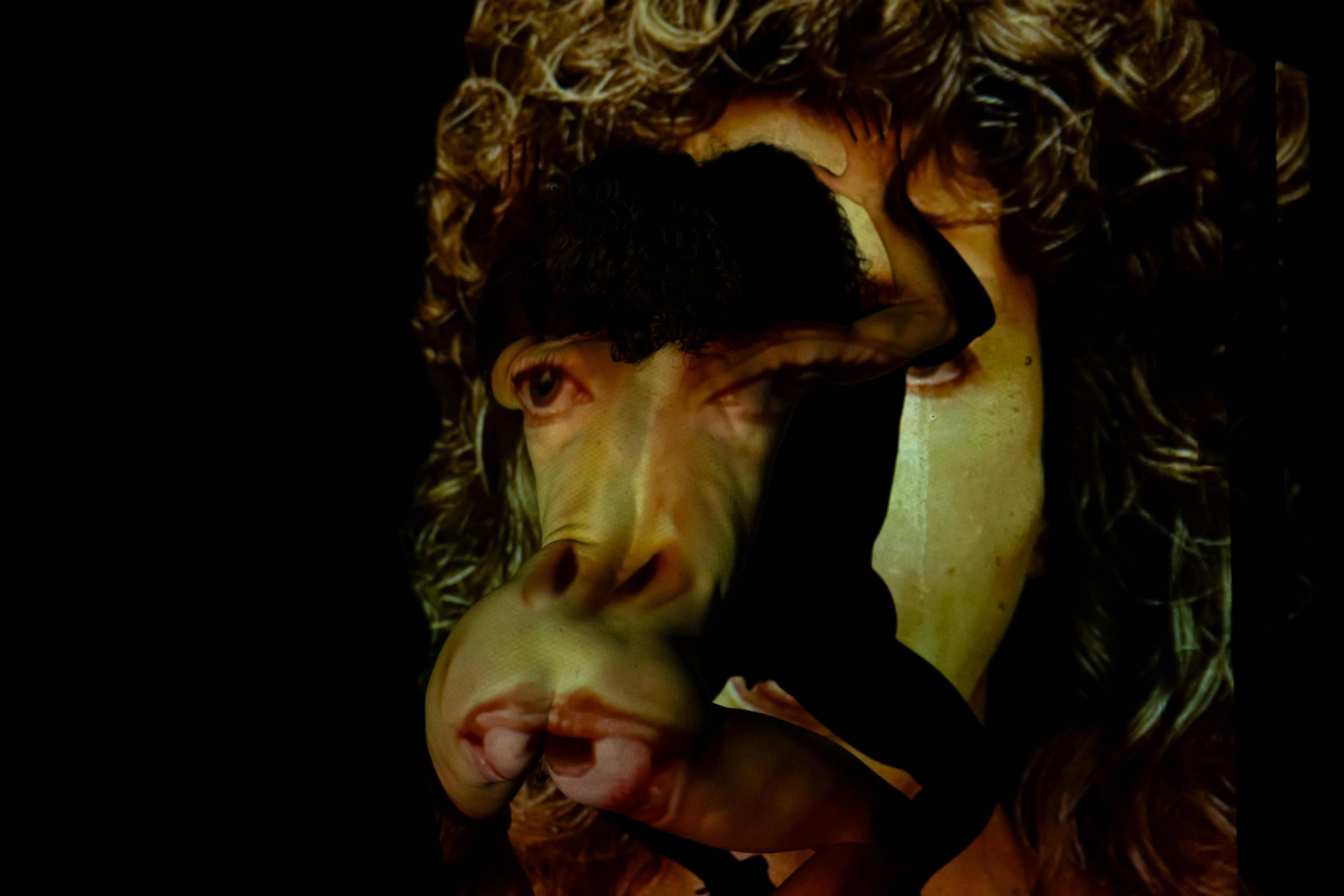 Auro Orso’s PERREO ENTRE LOS MUNDOS also bursts its performer into many identities. Topless, shrouded in a silicone garment, his body slurps and thuds low among the floor-seated audience, the loose second skin flapping and dragging. An experimental lecture on the neocolonial appropriation of reggaetón music (blending Latin American, Caribbean, and hip-hop influences, deeply tied to perreo dance culture) ruptures the situation. Orso, now standing, brings that legacy into the present, shaking his lone, brown ass in the faces of a mostly white audience. When he disappears behind a curtain, we’re left with Mahya Ketabchi’s robust sound design. I want to get up and dance into this reckoning; many of us are already gyrating. Orso reemerges and performs an exhilarating dance into a large mirror, wearing the silicone flesh as a muscular chest and a G string, giving booty at the back and package at the front. His face is wrapped in a fierce, sparkling wrestling mask. He climaxes into a sensual explosion of popping, swaying, and thrusting, driven by the dembow beat.