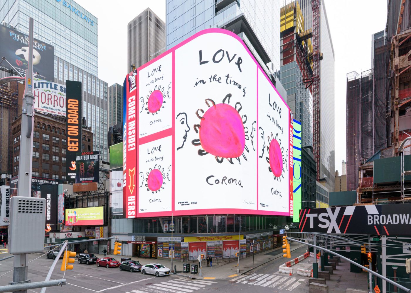 Amidst ads from frozen vegetable and teen underwear brands telling us onlookers to go home, it appeared that some opportunistic artists had tried to rebrand Times Square as a gallery, advertising space having become more affordable.