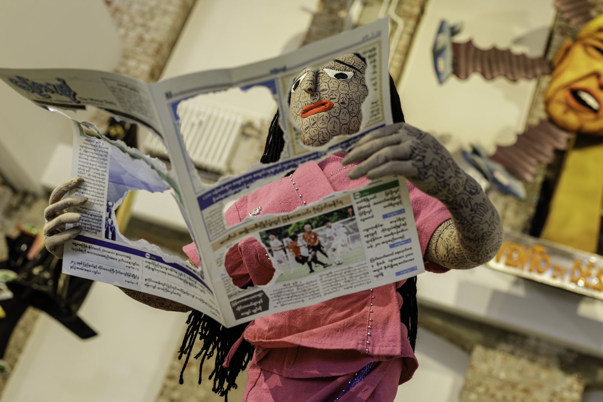 Why all this scene-setting? Because that accounts for the strange omnipresence of art here dealing with the civil war in Myanmar, which emerges as the exhibition’s unifying thread. Obviously, consciousness-raising about the plight of the Burmese people – their longstanding ethnic conflict, a 2021 military coup, and the genocide of the Rohingya – is important. The argument might even be made that the crisis there crystallizes numerous repressive currents in the contemporary world. It seems reasonable, then, at the KW, to see a filmed reenactment of an action originally done by a Burmese former political prisoner, Htein Lin, while he was incarcerated. The performance involved him convulsing, strapped in a chair, and finally swallowing a fly. At the back of KW, a ditch in the ground has been dug up by Nge Nom (working with atelier le balto), who was born in 1990. Nom, we read, launched a Civil Disobedience Movement and was chased down by military vehicles before she was taken in by neighbors. It’s a horrific tale, and a meaningful example of fugitivity and survival. It could have been worthwhile to see an entire room devoted to this person’s art and life and the movement she launched.