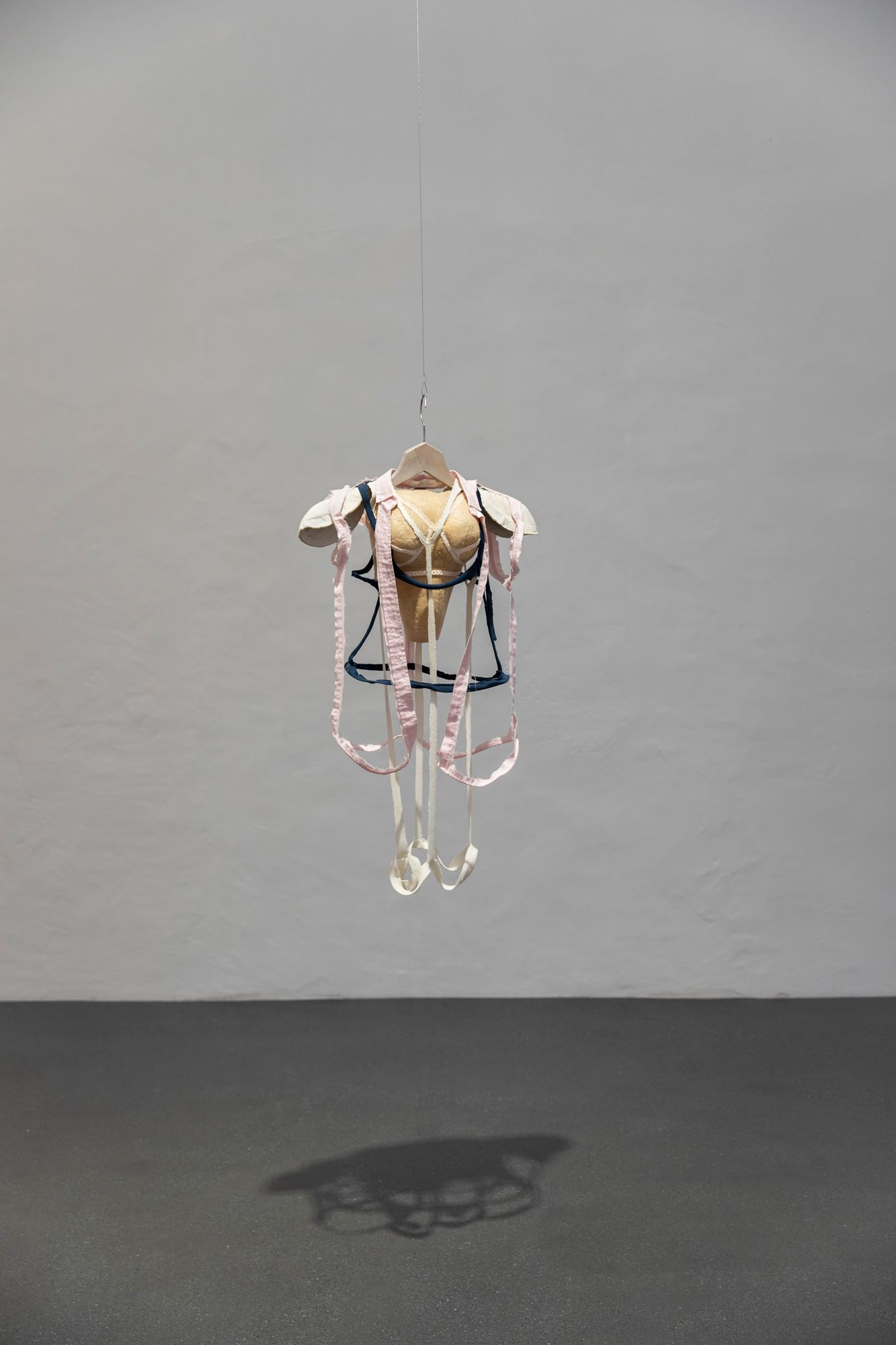 In short, Põder is an inspiring artist who created an oeuvre of great suggestive power and charisma under difficult conditions. In hindsight, the fact that she was already using textiles in the 1970s, along with “non-artistic” materials such as epoxy, plastic, or jute, and doing so in connection with female subjectivity, makes her an eminent representative of sculpture and installation art under the conditions of the material turn. The show is organized loosely chronological, moving upwards from the basement. Sculptures on a pedestal immediately foreground a wealth of materials: Based on mannequins – shiny, beige objects of desire – Põder developed idiosyncratic body assemblages, cutting up, deforming, or appending freestanding torsos with ropes and fabrics, her interventions visually drastic and unmistakably brutal. With titles such as Before Performance (1981) and Very Old Memories (1985), they carry something of an erotic charge, but also aggression and violence. The former work is a highlight: a figure realized in brown sackcloth and in the proportions of a mannequin, covered all over with patterns that evoke a foreign system equally useful and formalistic. Sewing patterns were long in short supply in Estonia, as in the entire Communist East, and therefore highly sought-after. But they also refer to standardized beauty systems – and thus, to patriarchal power. The feet of Before Performance stand in brown pumps with silver shoelace eyelets, while the other end of the body features an empty space instead of a head.