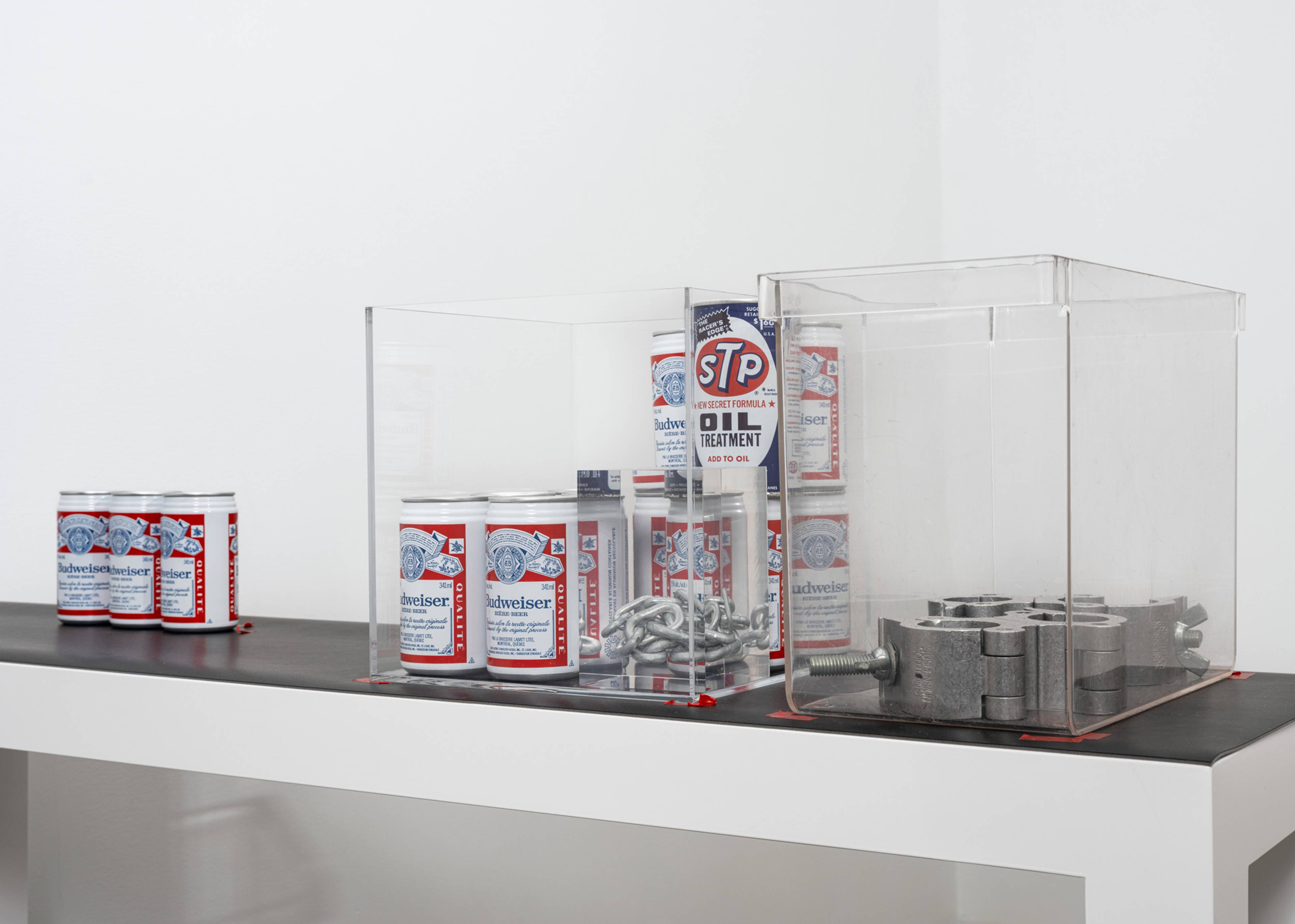 At Gagosian, Noland revisits that signature lexicon in a new series of untitled sculptures. Crushed Budweiser cans, sheriffs’ badges, and bullets are suspended in cast acrylic, crystallizing these objects as paperweights. In one piece, a grenade and a crumpled Coca- Cola can are placed on top of a white filing cabinet, its key sitting invitingly in the lock, while a wire bin containing aluminum trash-can lids is positioned nearby.