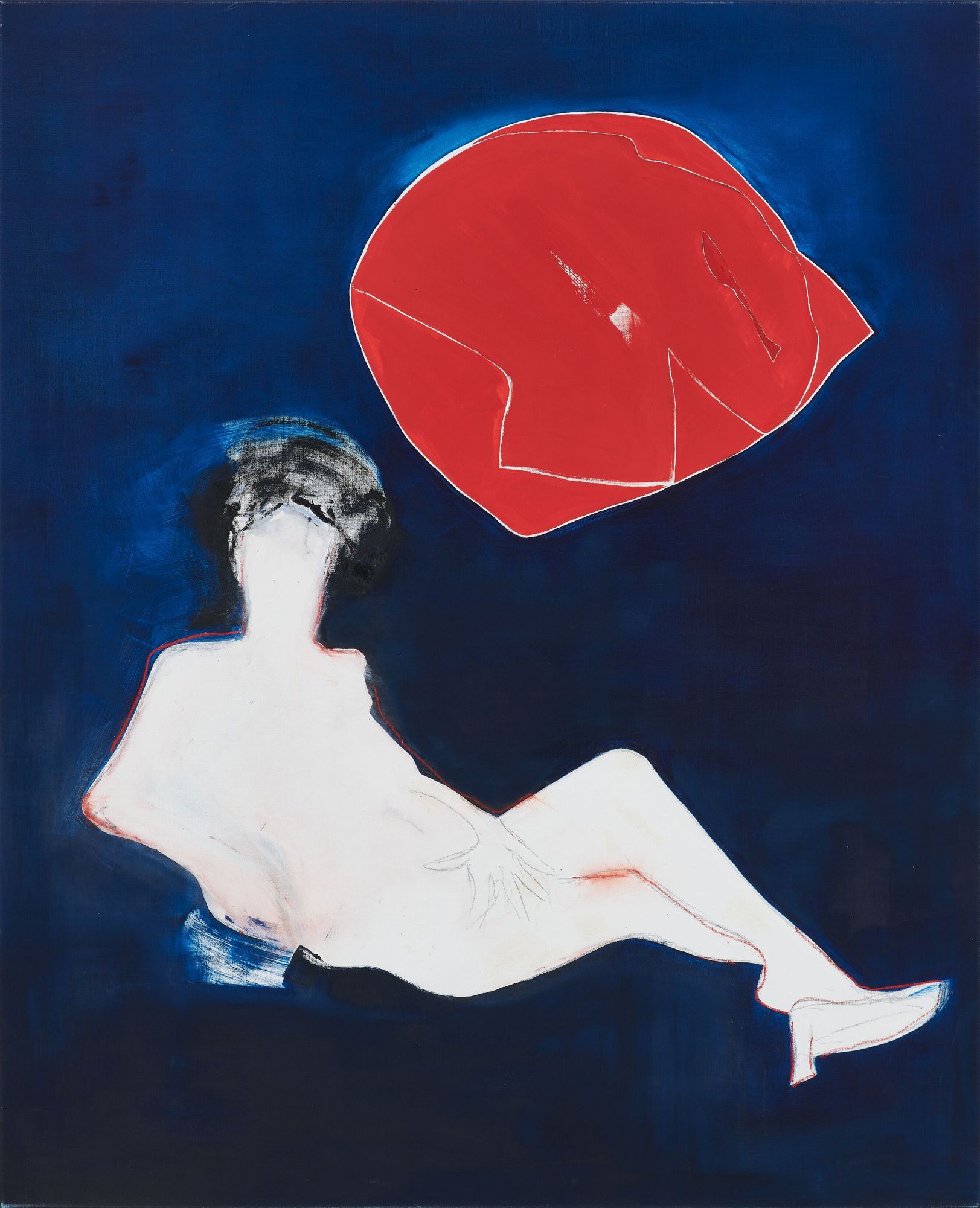 Returning to figuration in the “Venus” series (2004–06), these plains of distilled color become the context for a succession of female figures who appear to be perpetually falling; skydiving bodies unanchored from the physical world. Here, she co-opts her art-historical references: In reclining nudes “after” Manet and Titian, it is as though a light has been switched on inside each figure, and we can no longer make out their features though the glare; this is the gaze reversed, the nude as something transcendent and incorporeal.