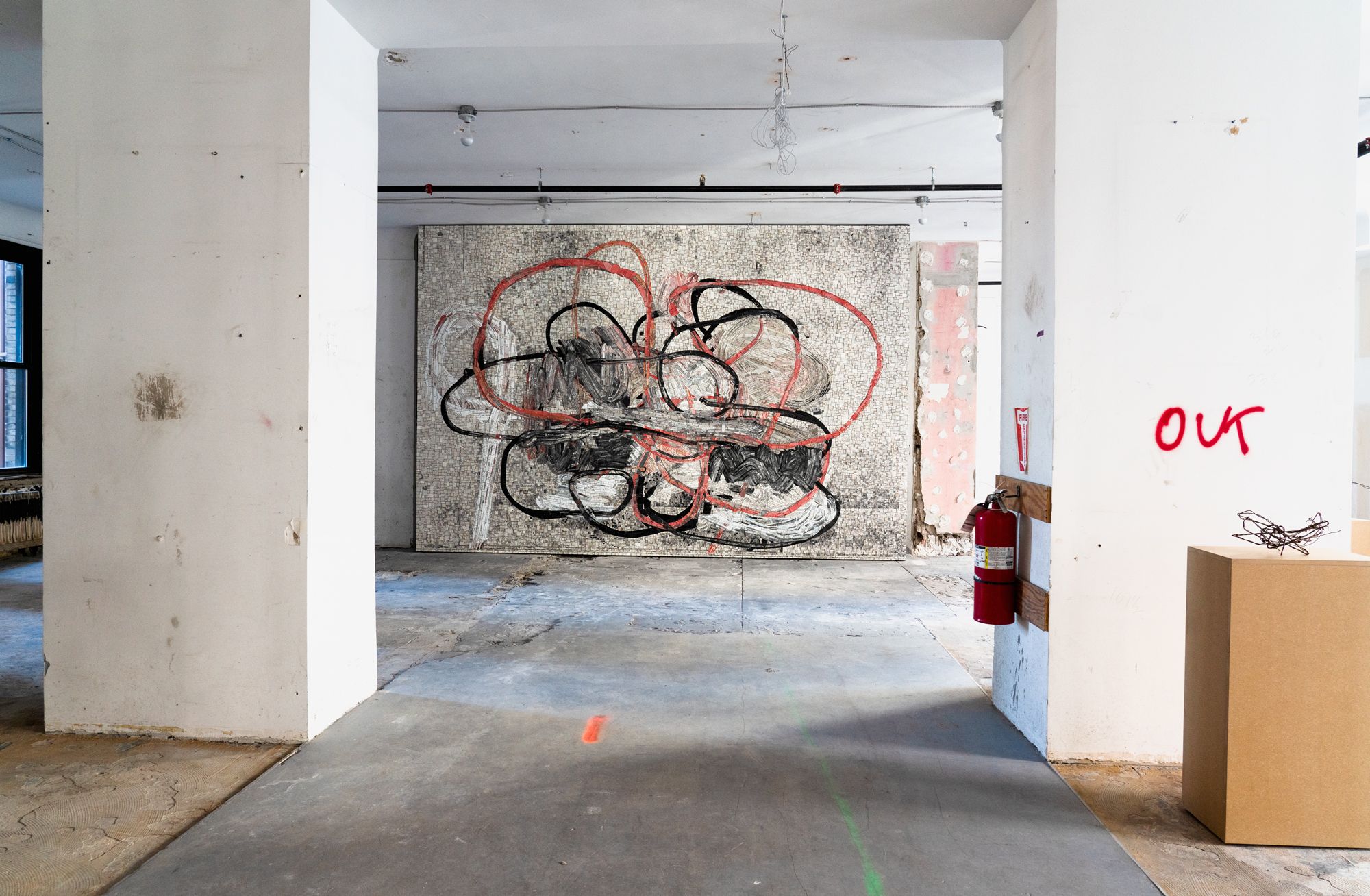 More broadly, the 1970s were a decade in monochrome. When you read the newspaper, ink would smudge your fingers. I remember it occurring to me later in the decade, while watching Blondie perform, that the band’s strictly black-and-white attire (Deborah Harry’s red pumps were the exception proving the rule) that this aversion to color probably meant that our sensibilities had been molded by black-and-white TV. Wool started out with an anti-chromatic aesthetic and has remained loyal to it, despite the distinctly Guston-esque pink sometimes mixed in with his grays these days. His work maintains its tight-lipped recalcitrance. And there is something of a post-apocalyptic feel to his recent show “See Stop Run,” self-organized by the artist in collaboration with curator Anne Pontégnie, in 1670 square meters of vacant office space in Manhattan’s Financial District – a decidedly more grandiose avatar of the holes in the city that some may remember, not quite nostalgically and not quite not, from fifty years ago. Once, it was impecunious artists who squatted abandoned buildings; today, the decision to sidestep the gallery/museum system comes from an artist whose market success gives him the means to legally occupy an important piece of commercial real estate.