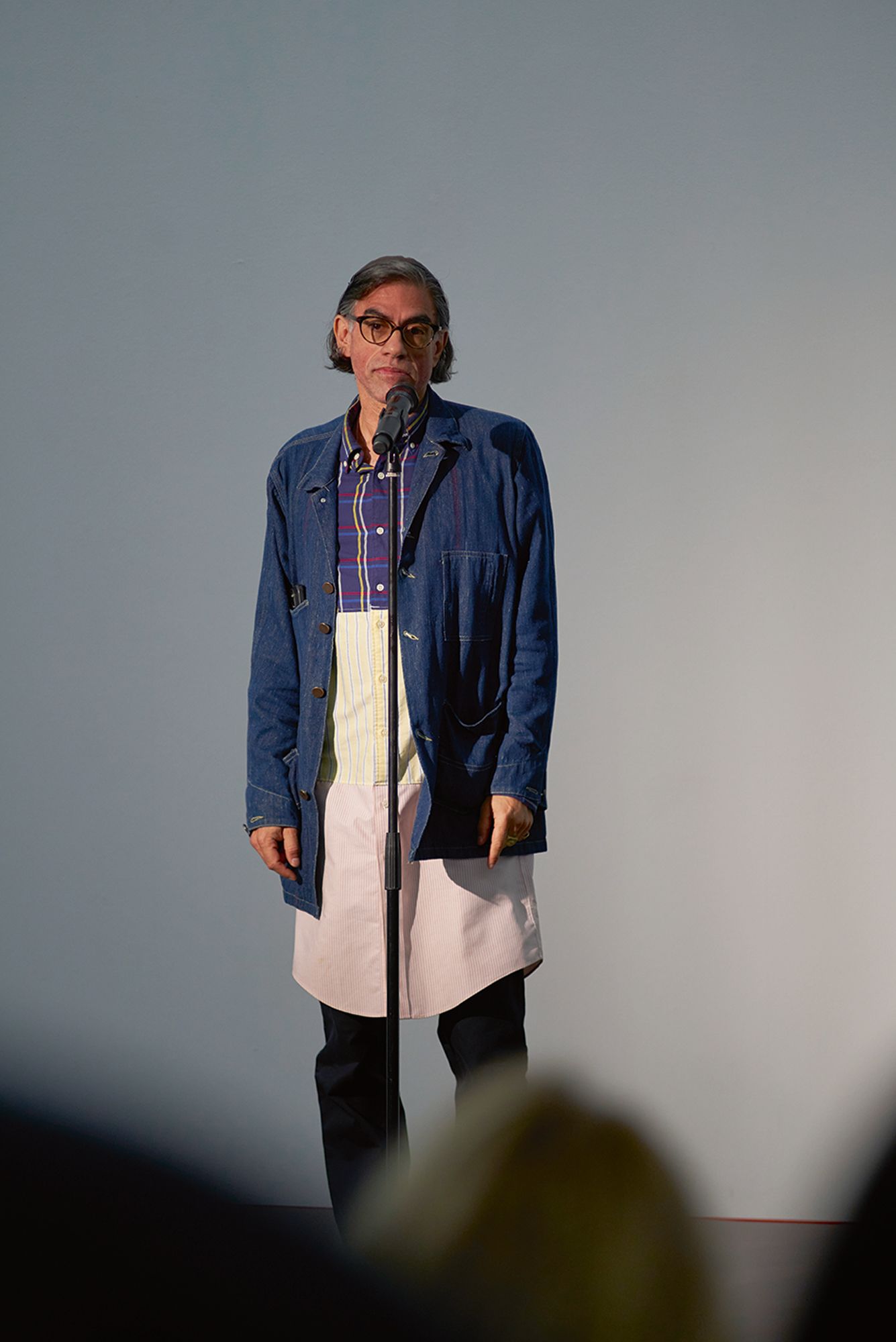 Shown in a black-box projection room, Before and After (Still in Progress) (2023) is a seventy-three-minute-long medley of previous speech performances (the artist always impeccably dressed), poetry, and a Yom Kippur address at temple, each segment followed by the same harrowing clip of Bordowitz’s stepfather breathing heavily in a hospital bed. Bordowitz, who has lived with HIV for thirty years, is acutely aware of the precise texture of aliveness, its snow-like quality. In a poem published in the exhibition booklet, he writes: “you walk into a room / and you know / he is gone / what is he’s gone? / is absence the evidence?”