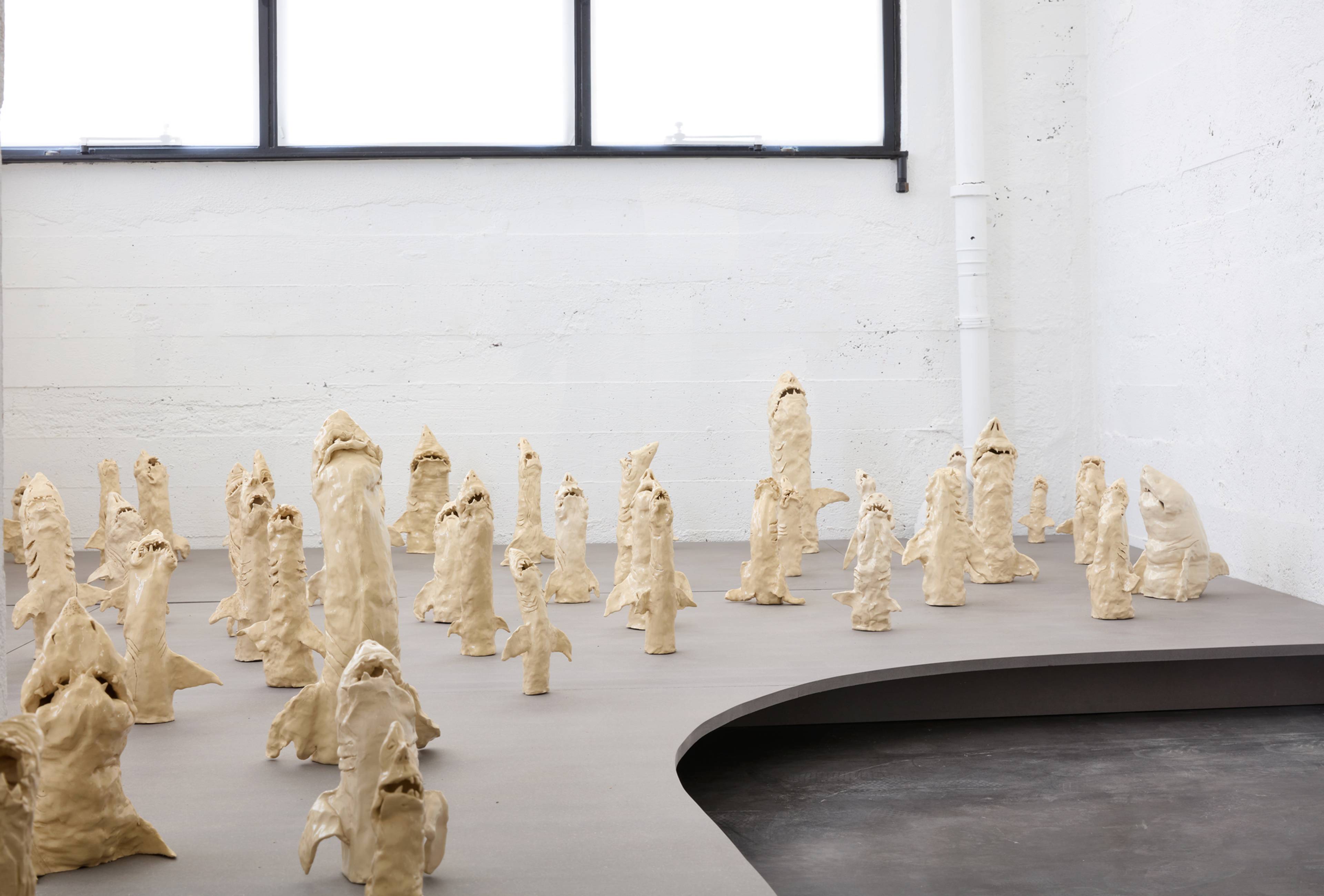 This “out-of-focus” work optically rhymes with Camera becoming painting (2024) – a large, straightforward painting of a point-and-shoot camera which makes visitors “feel seen” as they enter the show. For Euler initiates, “Oilopa” feels like a house party of friends old and new, with one notable absence. The iconic sharks of her 2019 series “Great White Fear” (aka, the old white dicks of painting) are only present as a crowd of small, beige ceramics (Great white fear, 2021) tucked away in a corner, like the shriveled ghosts of late modernism’s masculine ethos. In sight (2024), a self-portrait of the artist grimacing as she anxiously looks over her shoulder and takes a selfie, is installed as a pun above the ceramic phalluses – Euler always attempting to catch painting in the act, thereby turning self-reflexivity into self-consciousness.