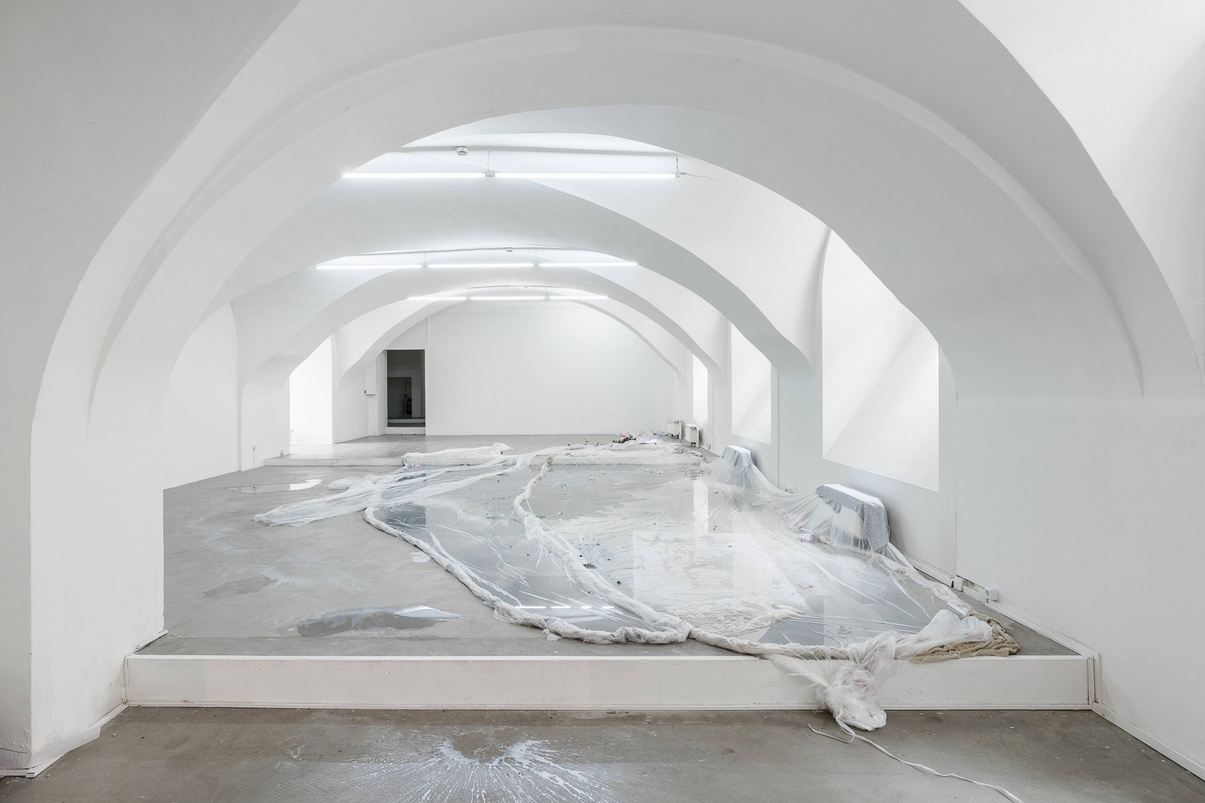 Upon entering Jason Dodge’s (*1969) exhibition at the Grazer Kunstverein, one might mistake it for a non-exhibition. The space appears empty, with only a few remnants on the floor, as if the previous show had just been dis-mantled. A lamp on the wall directs the eye to the next room, which looks as if it had been flooded by a burst pipe. Water – a hostile element in any art space – has infiltrated the main gallery. Waterproof foil, bordered by wet floor cloths, covers the ground; the heating is shrouded in transparent sheeting; candy wrappers float in puddles; crumpled, grayish plastic and textiles are scattered everywhere, perhaps laid out to dry.