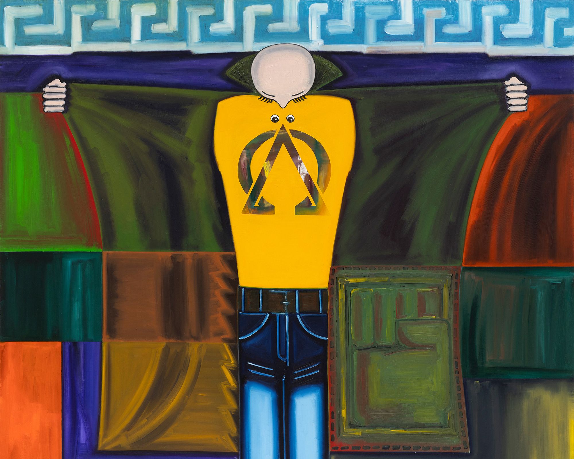 What’s going on here? A clue: the solidarity fist that recurs throughout, such as the quasi-self-portrait, People Who Look Like Me. The fist, this emblem of shared political commitment, with roots in trade unionism and workers’ movements, when painted here by a co-founder of W.A.G.E., an advocacy group for fair artists’ remuneration, is a loaded emblem. Likely, it’s a cipher for the entire question of political commitment as art, or perhaps in spite of it. In “Helping People,” Soskolne attends to whether or not the work of political altruism can ever be squared with – or indeed be a condition of – the often private work of painting. Provided that art-making requires some degree of selfishness, can there be an equivalent selflessness in that very same act? Soskolne wants to pursue these questions to the end, establishing a more or less hermetic codex of acts, signs, and dialectics that point to one possible asymptote of this radical formalism: a painterly ethics of charity, charting such ideas’ likely self-defeat. In the funky Noah’s Ark Hand Chair, we see the fist opened up, turning into an armchair (or, more precisely a “hand chair”), floating on water the way a Deadhead floats on a mental trip to nowhere.