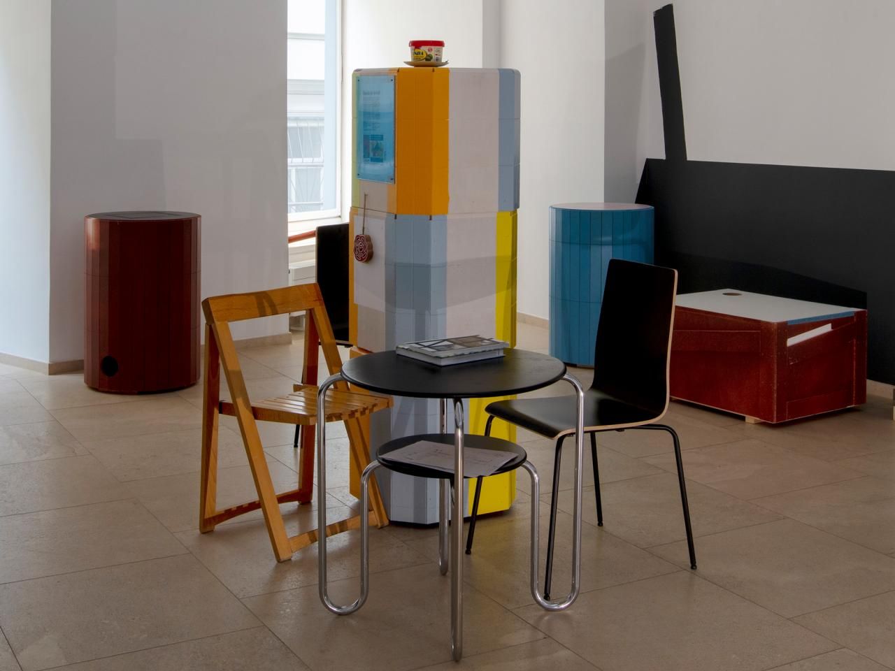 Who is OLAFUR panoni (sic), and what’s he got to do with Manfred Pernice? Besides the sculptor’s alter ego – a concourse of Nordic and Mediterranean monikers that are polar opposites on a European map – it’s an allusion, made in hermetic fashion, to the artist’s latest show in the renovated, snug antique space that Nächst St. Stephan has addended to the cobblestoned Domgasse. Its nooks, recessed, arched walls, and sweet proportions are a challenging proposition – there isn’t a straight line in the space. Pernice tailored his installation to the angled confines of the room. As you get your bearings, “Friedi” a store-bought, automated ReadyVac rolls around, keeping the spotless floor spotless, in between bumping into the low-lying “furnishings.” These circular, movable sculptures sit on casters, with holes cut out to allow imageless, projected light to shine through and crisscross the floor.