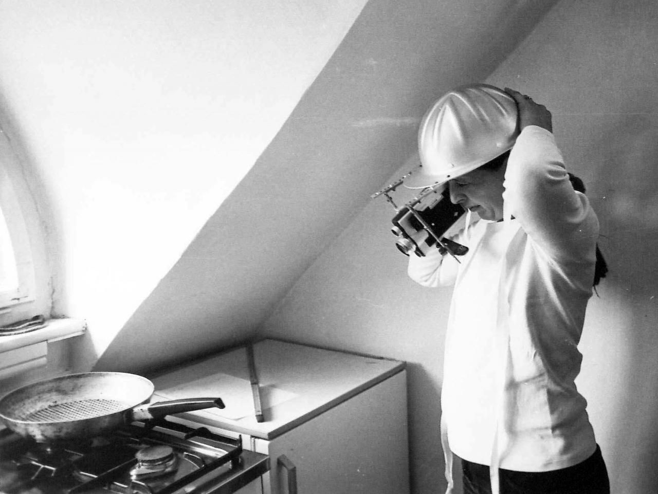 At the outset of her artistic career, Raspé, already a single mother of three, developed her so-called “camera helmet,” or a hardhat equipped with a Super-8 camera, in order to film her housework hands-free. She whips cream into butter in Der Sadist schlägt das eindeutig Unschuldige (The Sadist Beats the Clearly Innocent, 1971), breaks an egg for a cake in Backe backe, Kuchen (Bake, Bake, Cake, 1973), and does the dishes in Alle Tage wieder – let them swing! (Every Day Again – Let Them Swing!, 1974), unseen throughout, yet imminently present. Every movement, every view is her own, conveying a self-possessed focus that turned the home’s confinements into a space of artistic agency.