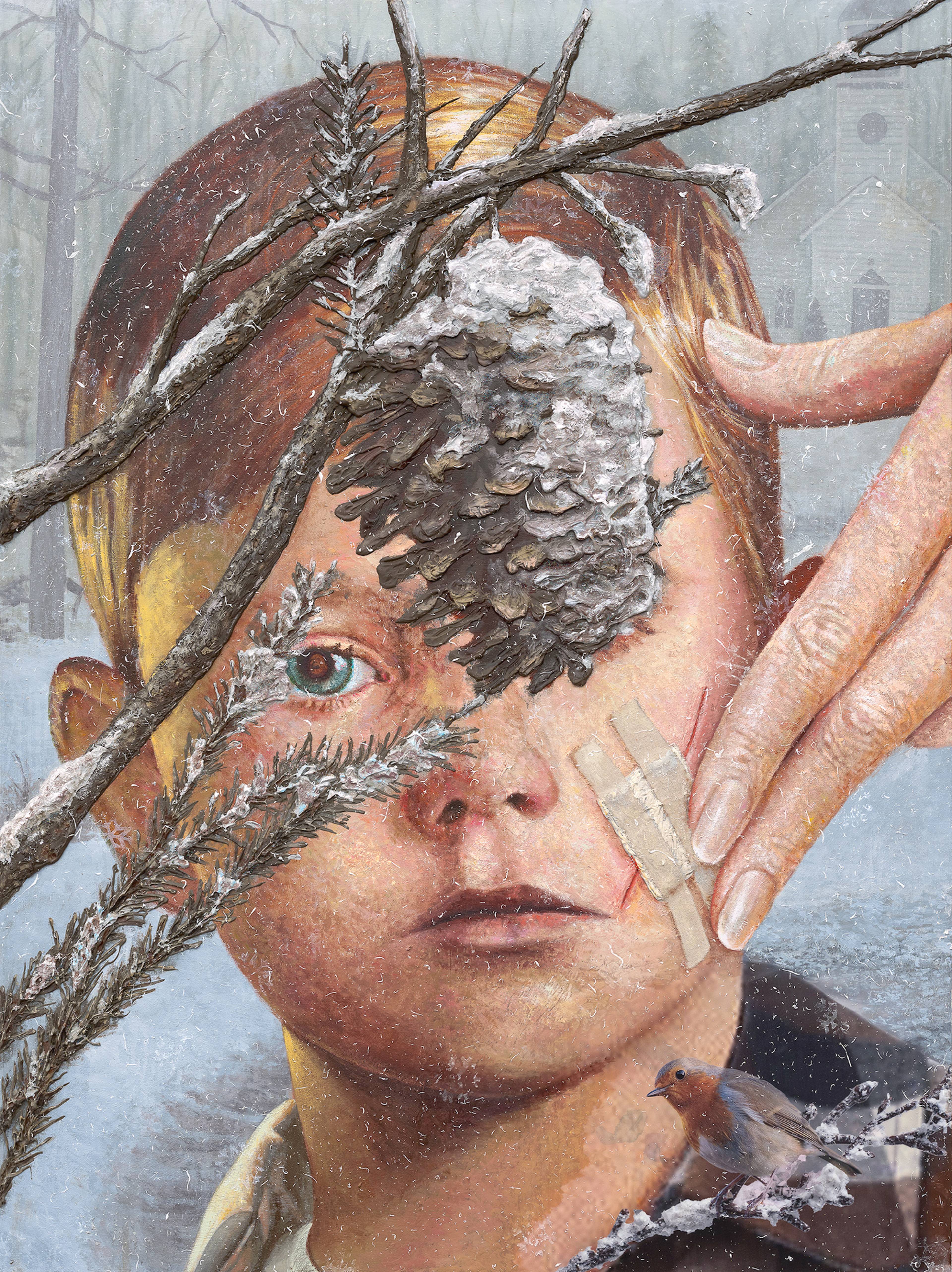 Perfectly timed with yuletide, the dense, tonally varied, mixed-media assemblages of Trey Abdella (*1994), of West Virginia, dangle a promise of festive cheer, only to expose the fickle, superficial sentiment that lies beneath. Even when he tones down his more cartoonish excess, and works in a more illustrative, realist mode – as in A Little Birdie Told Me (all works 2025), a beautifully rendered painting of a young boy whose face is obscured by an oversized pinecone – any hint of tenderness is stripped away by the seemingly random inclusion, in the center of the boy’s eye, of a howling man. It’s typical of the artist, offering the comfort of familiar, mawkish imagery, only to crush it with nasty visual intrusions – often arriving so shockingly and so insidiously that it’s impossible to find them funny.