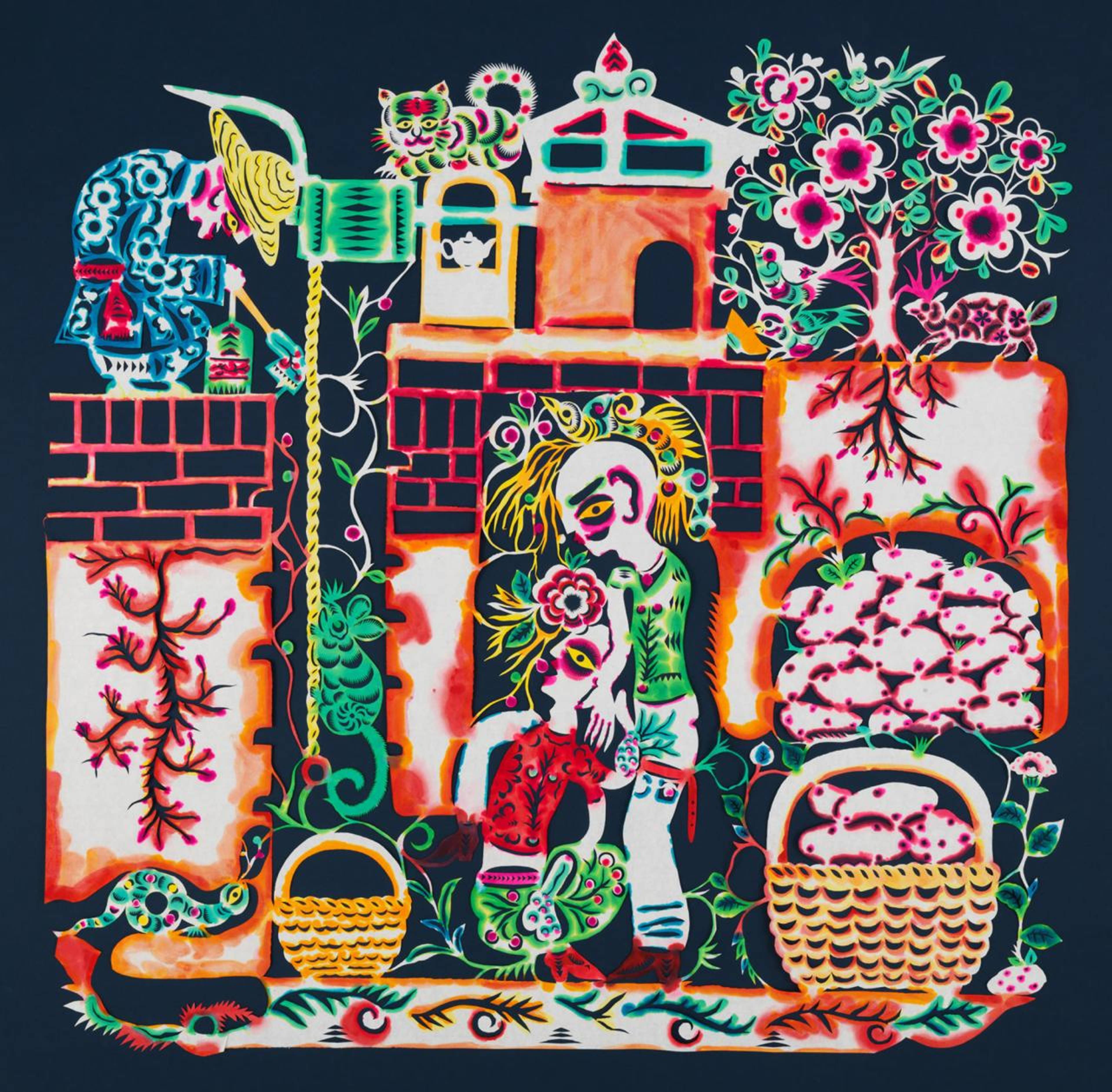 Xiyadie, Joy, 1999. papercut with water-based dye and Chinese pigments on Xuan paper, 20 x 20 cm