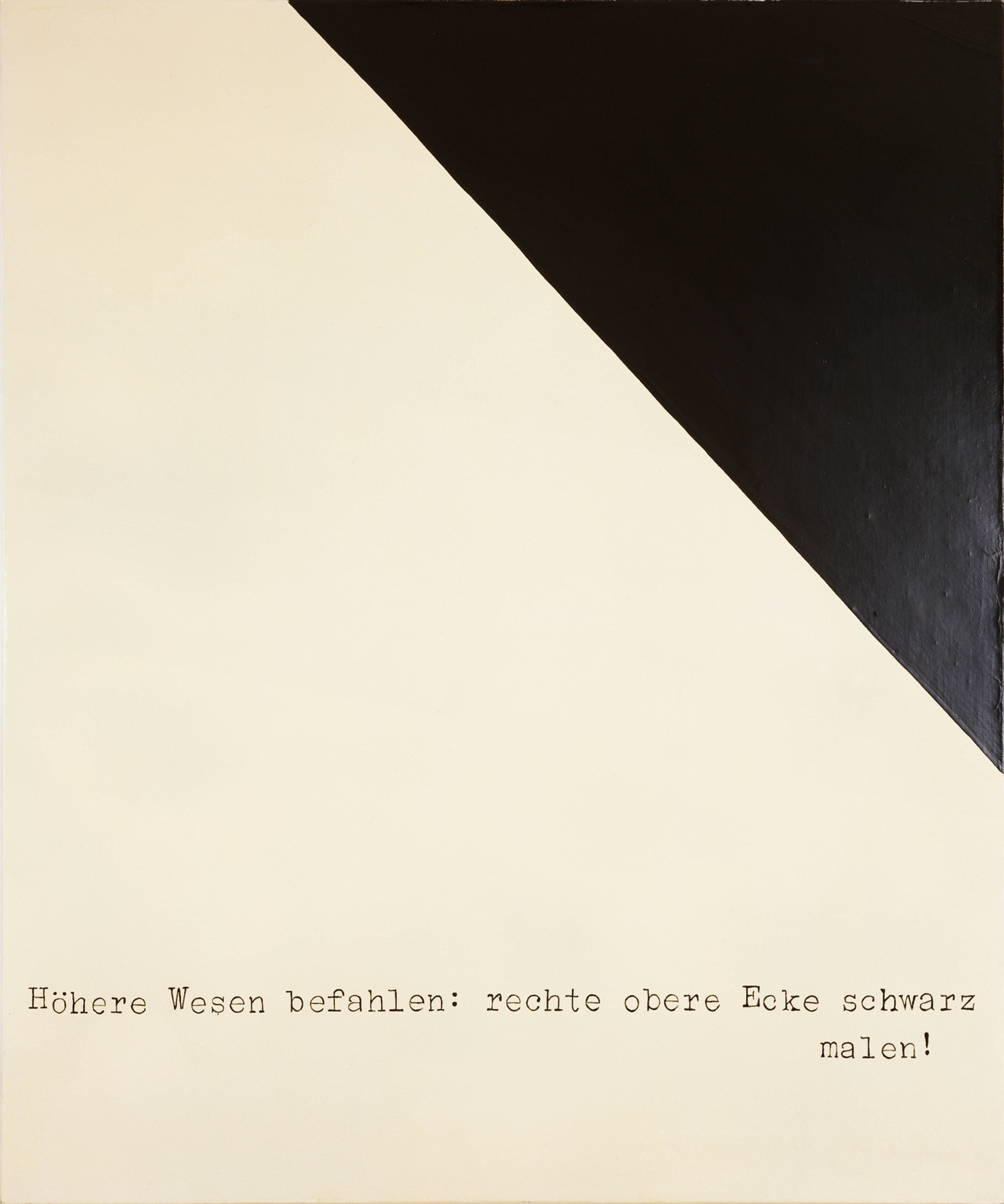 Higher Beings Commanded: Paint the Upper-Right Corner Black! It’s 1969 when the painter Sigmar Polke (1941–2010) hears these voices from offstage. He immediately obeys their command. A painting on the surface of which almost nothing is to be seen, which holds no secrets. A painting wherein there is nothing to discover but the black corner in the upper right, pushing into the edges of the 1.5 x 1.25 meter white canvas.