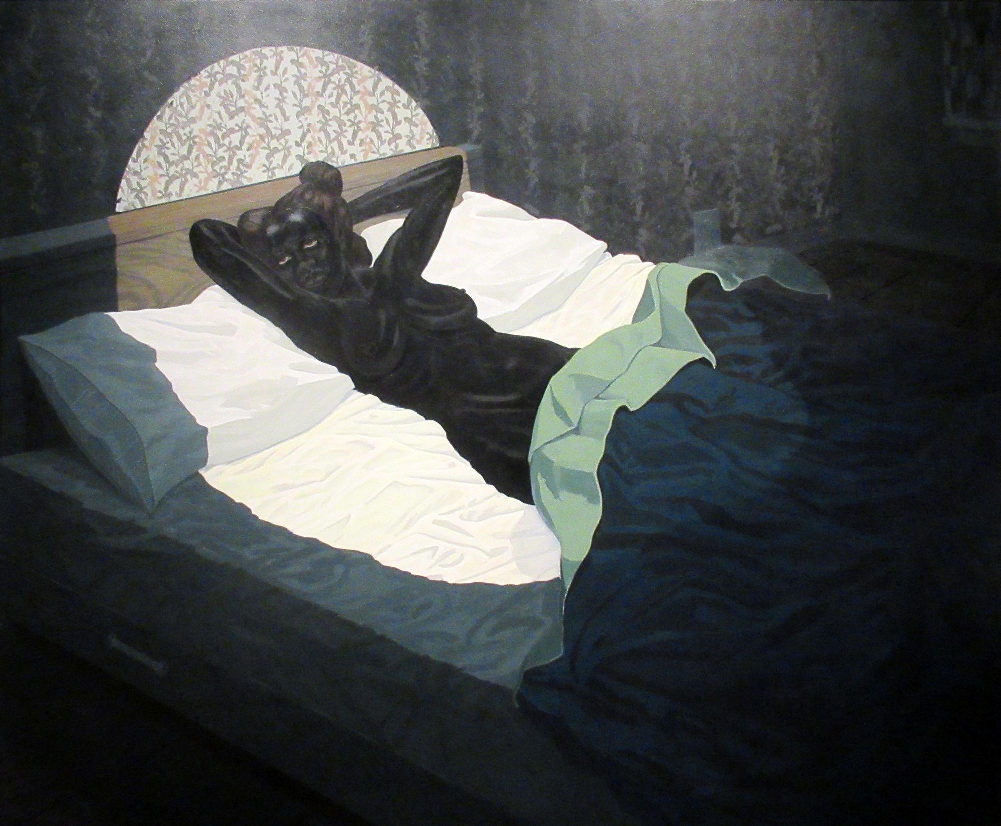 lies in bed, a crumpled blanket pulled down to her pubic bone. Lit from above by a large, white beam, her gaze turns toward the artist while her hands cradle her head between two pillows, depicted like I might look at a lover. This is one of the hidden beauties of this exhibition – that, as viewers, we get to participate in this intimacy without reducing the characters to emblems of sexual exploitation or ourselves to voyeurs. Mainstream US popular culture does enough of that. Elsewhere, Michael Armitage’s Kampala Suburb (2014) shows two men kissing. However, the figures are rendered in vague terms, in silhouettes offering few clues as to their context, as if the romantic gesture were illicit – a secret liaison I am allowed to witness because I am looking with.