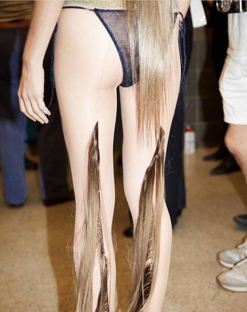 The show was stunning – delicate but commanding. Five-foot-long slick back ponytails. Tracks of hair extensions sewn to the seams of stockings. A sheer lace catsuit with a matching bolero. A knit moss-green bustier with a knit black thong. An iridescent whisper of a blue dress floating across the halogen-lit landing pad.