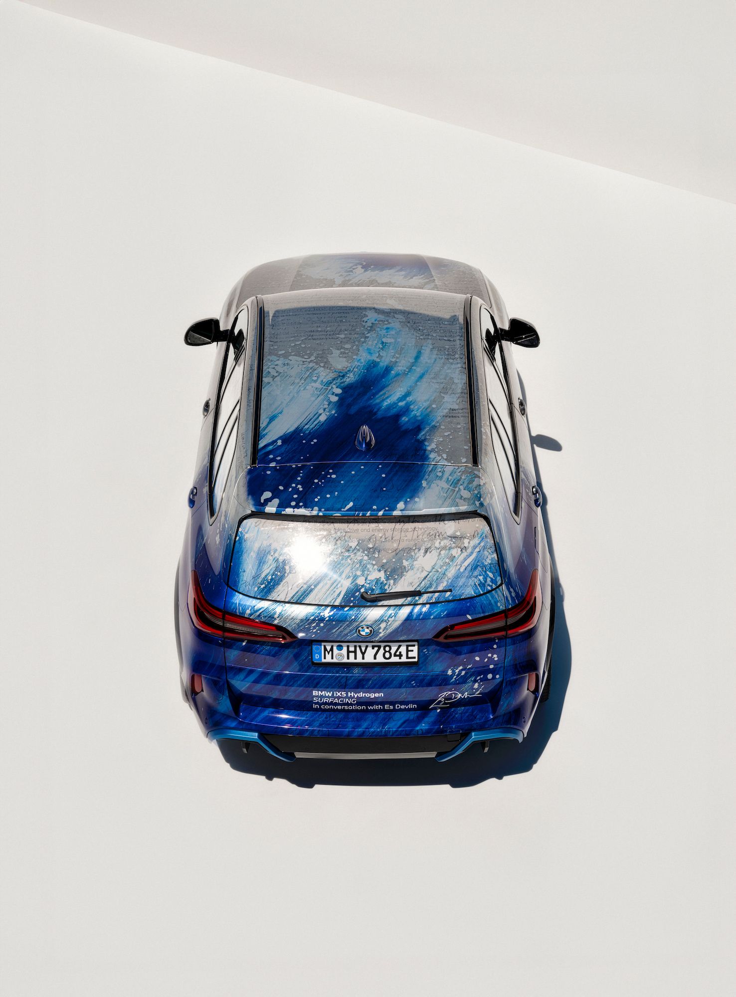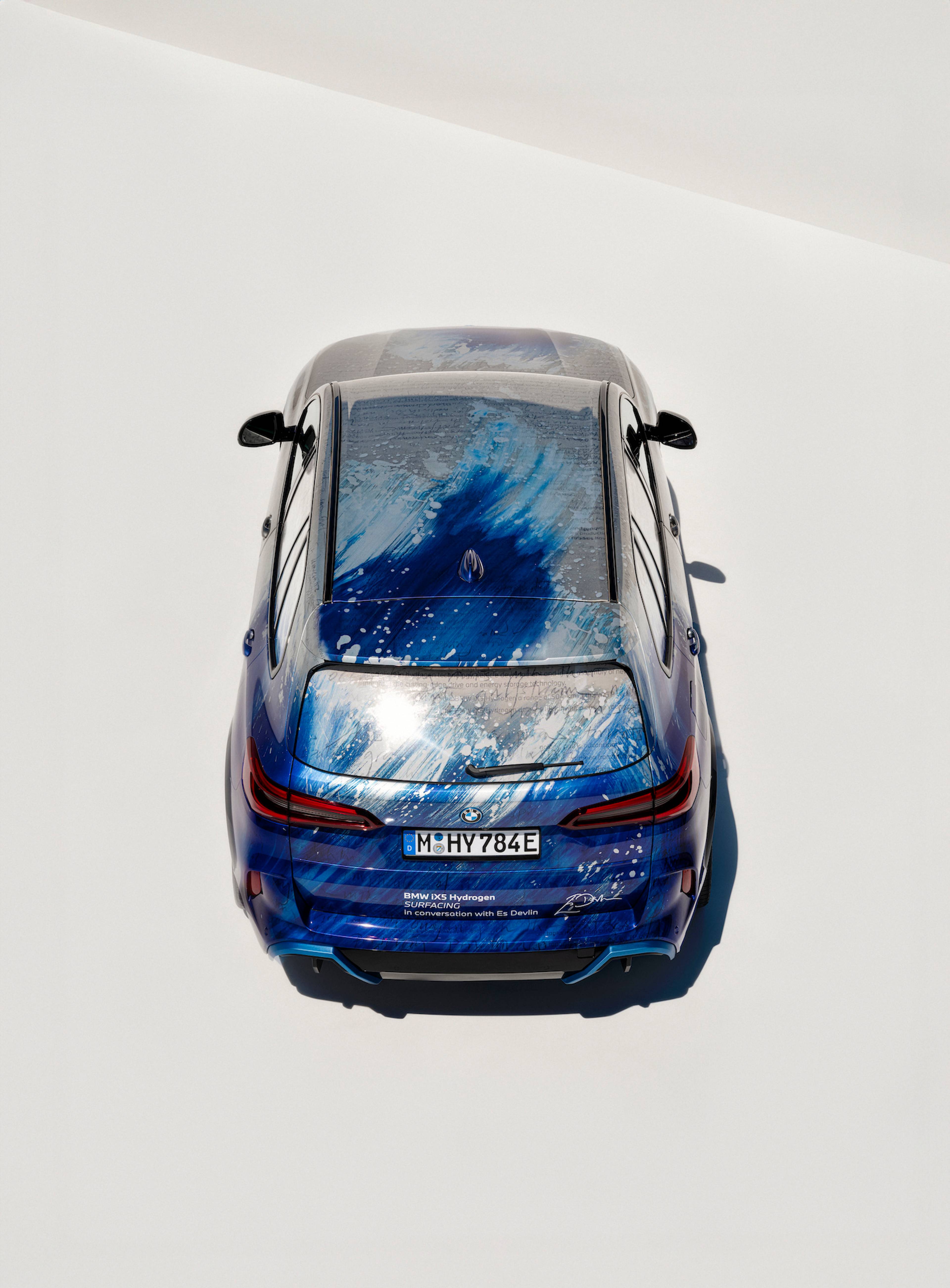 Surfacing is the installation and seven-minute performance that BMW commissioned to British artist and stage designer Es Devlin (*1971), in collaboration with Paris-based choreographer Sharon Eyal, for Art Basel 2024, which the company has partnered with for twenty years. Water is at the heart of the car firm’s newest pilot project, BMW iX5 Hydrogen. Hydrogen – the lightest element of all, and the most abundant in the universe – is set to play a crucial role in the global shift and duty into carbon neutrality. “I learned from the BMW engineers the beautiful symmetry of the system at work within the hydrogen fuel cell,” says Devlin about the test vehicles that could be found outside the fair as shuttle service for VIP card holders. “The energy that is used to separate hydrogen atoms from oxygen is recreated when the oxygen is reunited with hydrogen within the car. The by-product is not only the energy which propels the vehicle, but water.”