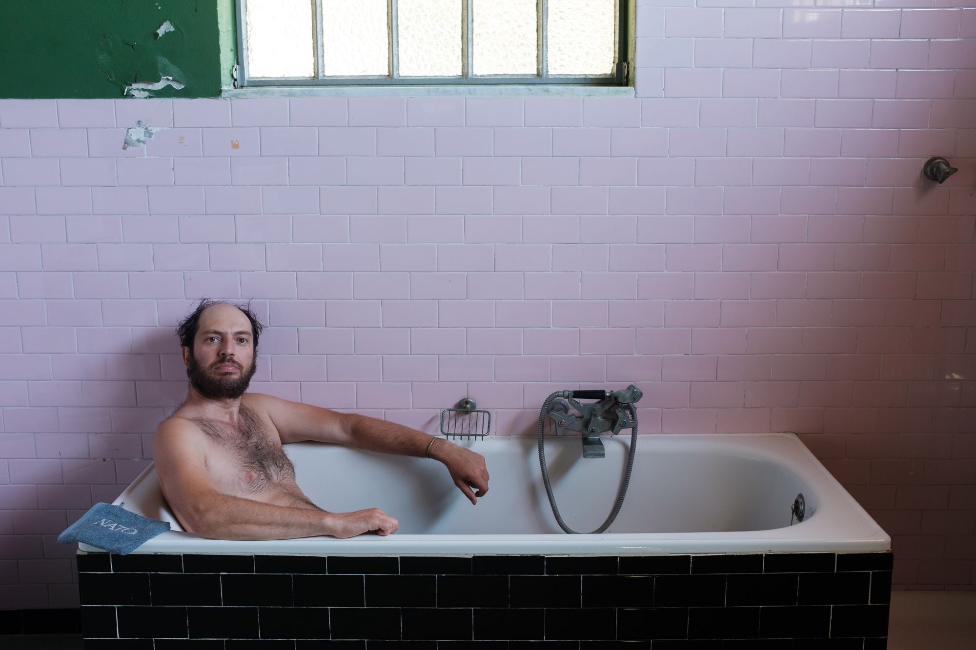 Wolfgang Staehle sits in The Lodge, 2023, chicken coop, chicken wire, reed, string, wire, wood, slate, and straw