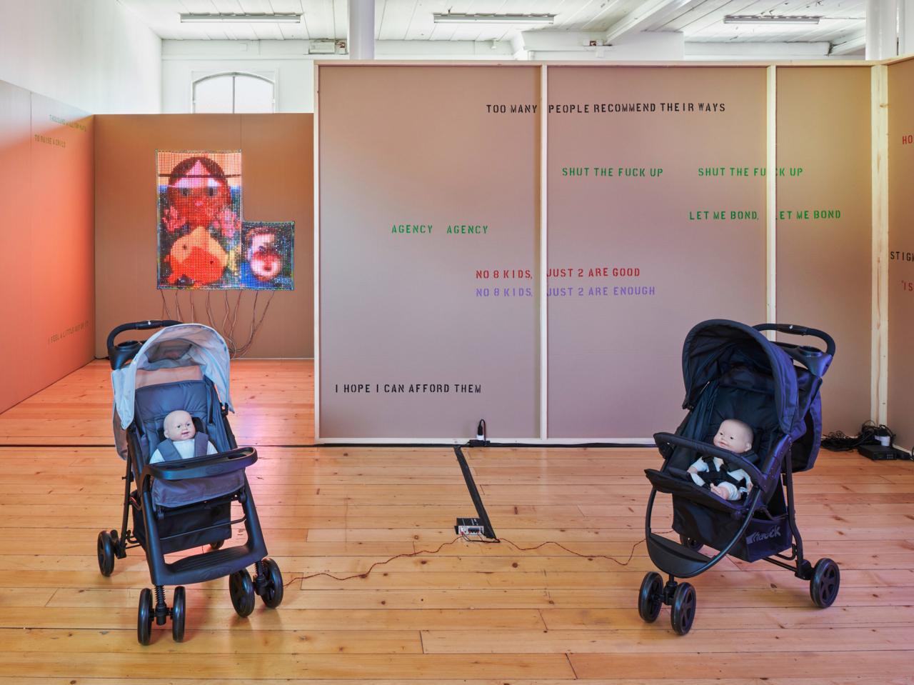 Ei spoke with three artist friends, all painters (Nicole Eisenman, Laura Owens, and Trevor Shimizu), to invite their perspectives on parenthood. He also imagined exchanges with two deceased artists (Alice Neal and Mary Cassat, the latter of whom never had children) in order to understand historical shifts in the model of the artist-parent. He then worked with the artist and composer Celia Hollander to turn these conversations into a libretto for synthetic voices, which sing out from behind LED reproductions of works by each of Ei’s subjects. These “figuring paintings,” as he calls them, are mounted inside a winding cardboard structure whose walls are stamped with the libretto’s lyrics, at the heart of which a circle of plastic babies in strollers debate the logic of their own births.
