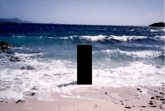 More than evidence, the photographs in the Epstein Files furnish a kind of art. The redaction becomes a thing in itself, a solid, a 4D space of pure potential. Not to belabor the eerie creep of Epstein with his arms around two black rectangles in a blown-out snapshot, or the softcore slivers of black and white nudes at the edges of black squares. One striking picture says it all: a tall black vertical centered in a horizontal photo of an azure beach. A shadow cuts into the surf, as if thrown by the redaction itself.