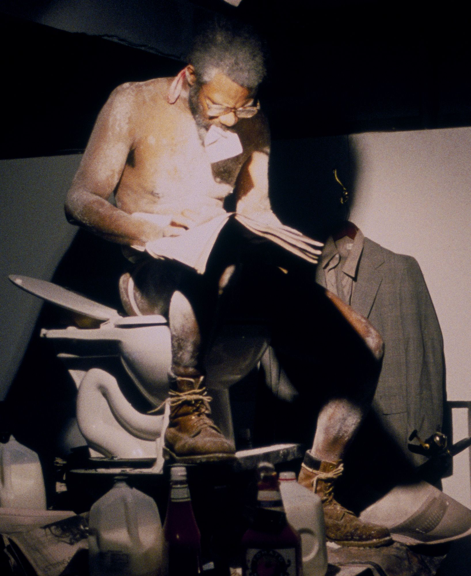 Assembly, or, better, assemblage – the adding of one individual thing to another until they take on new significance, able to stand alone and also gaining new possibilities when taken as a whole – is a key part of Pope.L’s artistic process. In Eating the Wall Street Journal (1990–91), the artist consumes America’s best known daily financial newspaper while seated on an American flag, wearing the same aspirational attire as in Tompkins Square Crawl. When Pope.L revisited this work at SculptureCenter in New York in 2000, the artist sat perched on a white toilet, wearing a white jockstrap and glasses and covered in flour that formed a crust on his body from milk and saliva. He was surrounded by pages of the newspaper and lit by a single aluminum clip light. For approximately three hours, over the course of five days, the artist periodically ate small portions of the Journal, at times adding ketchup or taking a drink of milk. From the first version of the piece, Pope.L had learned that newsprint contained chemicals that should not be consumed, so he spat out the chewed-up shreds, which inevitably accumulated over the duration of the piece, alongside the emptied milk containers that had been cast to the ground.