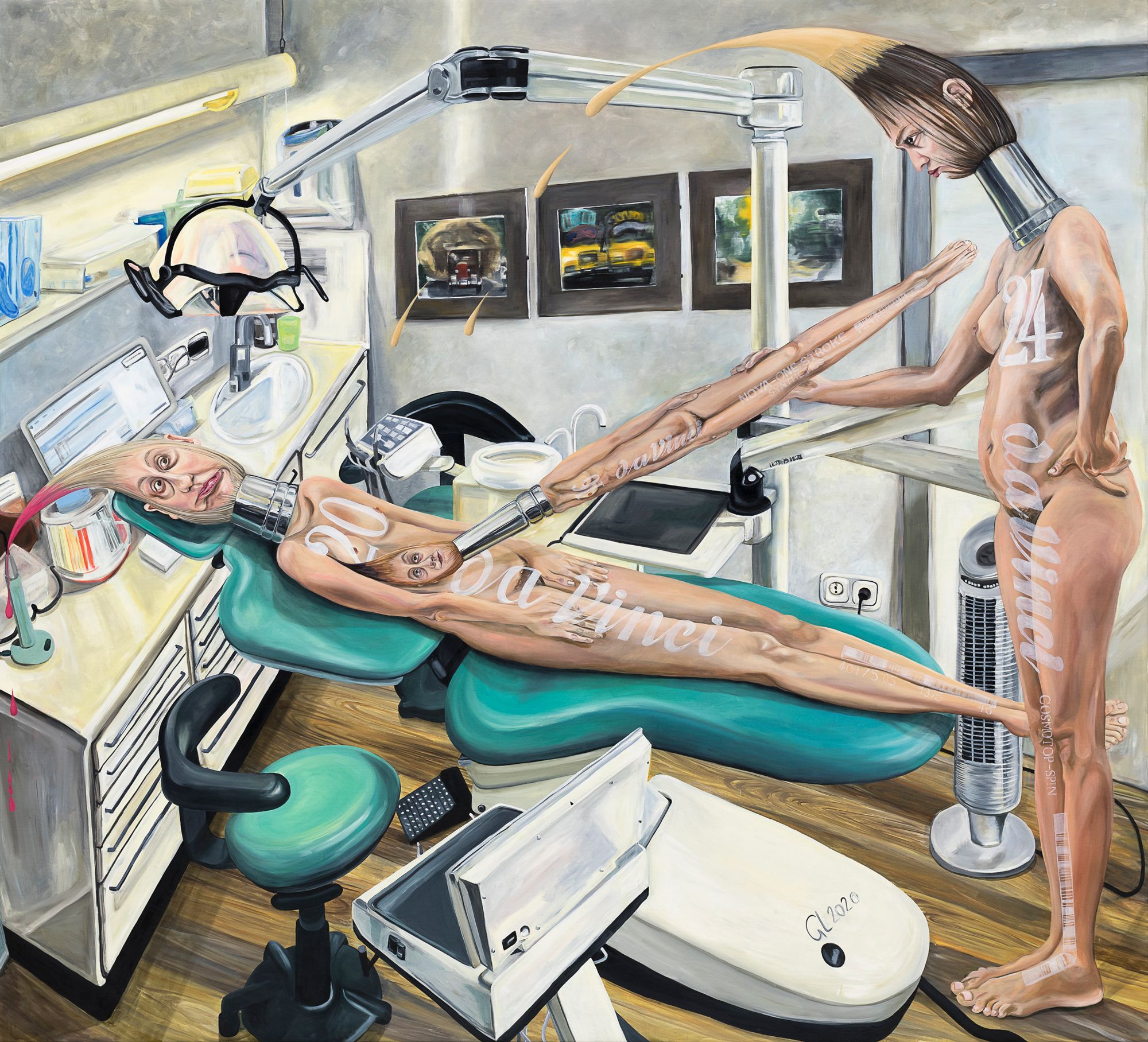 Known for critically embodying the conditions of its own production and circulation, her work is associated with the concept of “network painting” – a German tradition inherited in part from Martin Kippenberger and reinvested by theorists like David Joselit in the early 2010s to discuss painting’s “good mood.” By redefining self-reflexivity to include the social context and the economic or institutional networks that painting operates in, the medium remains capacious, instead of becoming an endgame. In doing so, painting also gains a “quasi-subjecthood,” evinced in Euler’s latest works in the most literal way. Near the entrance, a sign painting gathers the anthropomorphic characters that populate Oilopa-Allee: a wet da Vinci paintbrush, a can of Amsterdam spray paint, and a camera.