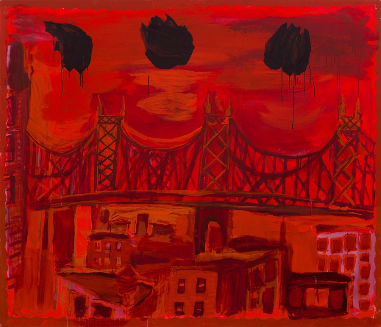This psychological language is perhaps unwarranted in a review – paintings’ subjects don’t feel anything – but in a show that uses one of the Western world’s most diagnosed “mood disorders” in its title, it’s hard not to read Smith’s red as a kind of supplement that the paintings “need,” an anxious attachment that gives them a sense of “identity” in an otherwise undetermined emptiness. This “self” and its modes of expression, so often present in Smith’s paintings, are no longer aggressively obvious or wearyingly performative. In “Living with Depression,” Smith bears witness to a “self” that tries to camouflage its own survival in a world choked by apocalyptic smoke, a world whose own psychic disorder is as hollow and infinite as the color red itself.
