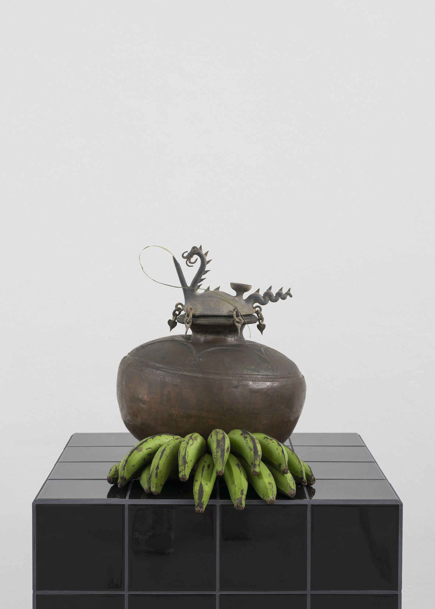 Behind are the eighty-five-year-old artist’s latest ikebana and a pair of Oldham’s, all arrayed on pedestals that, tiled in glazed black, look incongruently like phone screens. Dashed with rain, the wind moaning through a cracked-open window teases out new scents: several yellowing lilies, their stems eking through a bolted iron box, are dustily sweet (Strange Callas III), while a brace of chubby green bananas, prostrate before a copper pot topped with a mustachioed dragon, are mellowly astringent (A Healing Spins Dreams). I poke my head towards ribbons of long beans to smell the withered carrots bedding a bell-like basket and breathe deep – only to see myself looking back, nostrils flared from a mirrored Christmas bauble. It’s not the only sight gag: A single traditional ikebana, of greening willow sprigs twisting from their bamboo vase like a hungry flame, is offset by, to one side, an old-fashioned bed-warmer playing at being a water bug (one magnolia leaf as its tail) and, to another, four wrinkly leaves of cabbage, each draped like an elderly hand over a delicately lipped ceramic plate. As though to say: Look how long we’ve been, how far we’ve come.