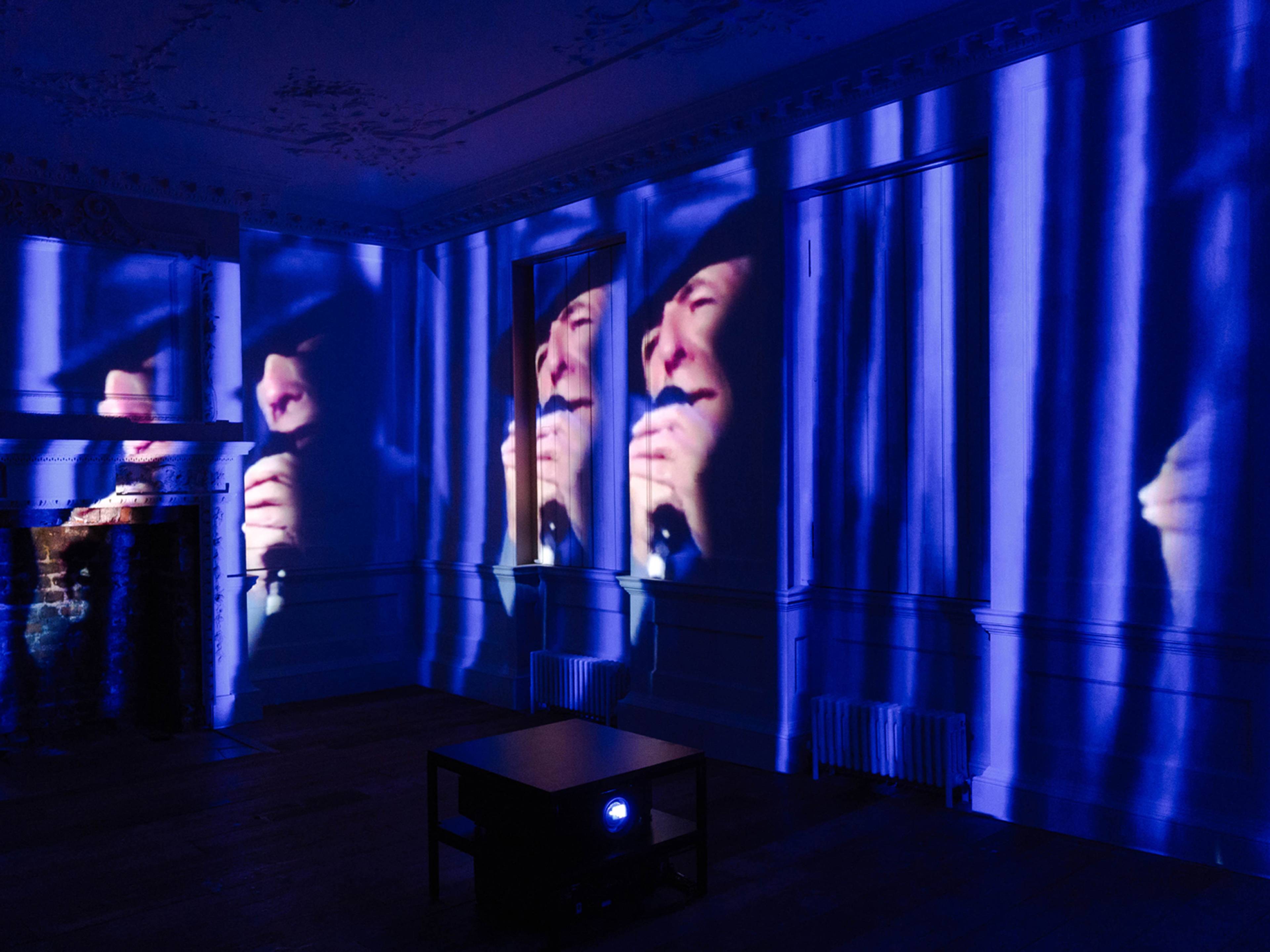Upstairs, Magic Mountain (2015) forms a literal, Berg-like buffer, its glacial mass of punk-stud audio-foam peaks disabled as absorbers of juggernaut sound. As what establishes a shell or border is fleshed out into a subject, material configuration assumes alluring depth. The impenetrable ravines of this mute massif engulf the attention, its looming scale drawing the eye into darkened crevices that lead to obscure dead ends. Magicking up a fiction from the mundane real, her mountain is a loss of grounding; it can’t, though, incorporate the needy resuscitations of Leonard Cohen in PLEASE (LC) (2013–15), installed in an adjoining room. In this four-channel video projection, the singer is all melancholy, pleading interminably amid a roiling, Lynchian blue. Chords overlapping in woozy disharmony, Cohen’s eight-fold processed vocal hovers between the metronomic and the incantatory, its sonic exhaustion an aberrant measure of time.