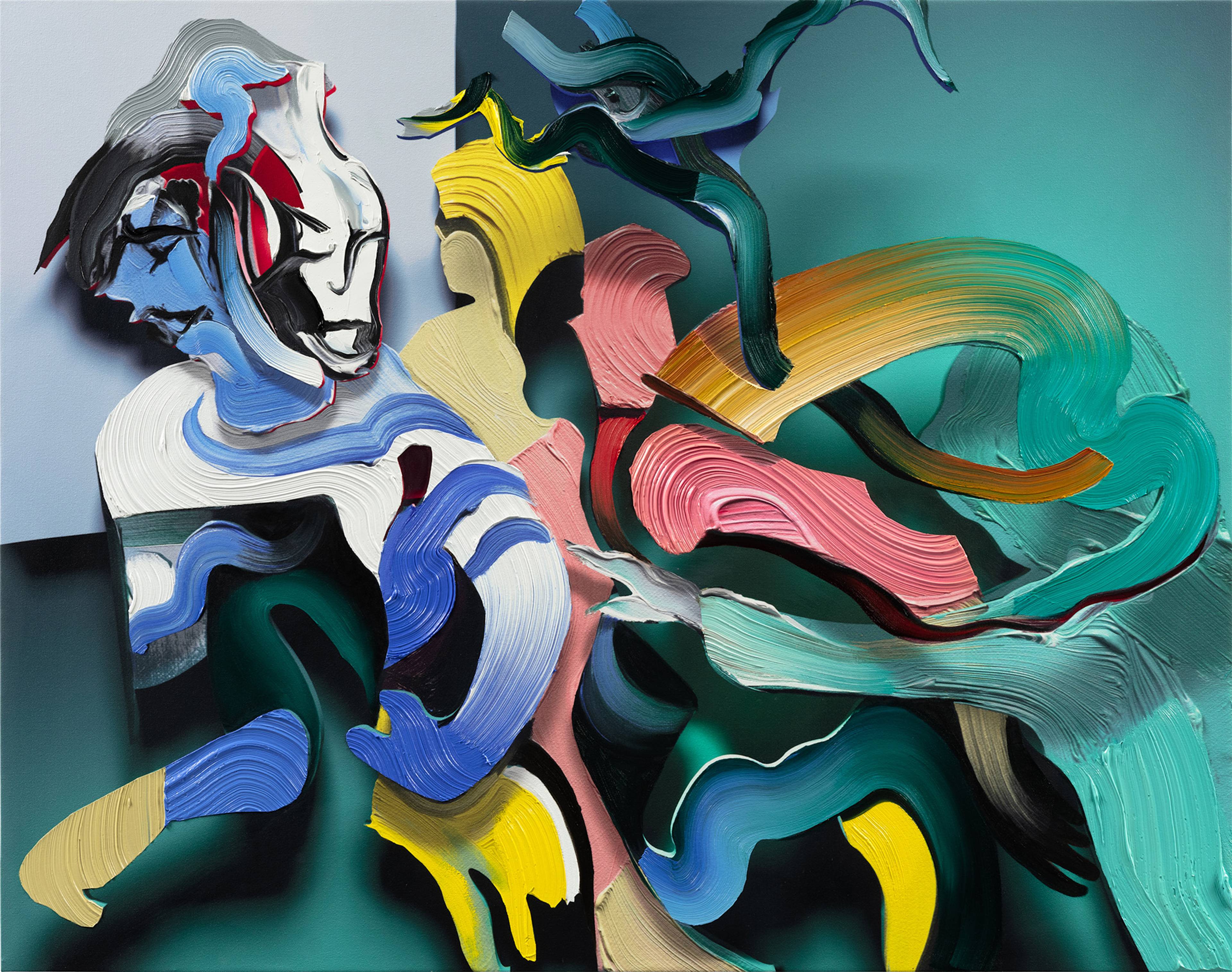 In fact, the small-format oil paintings in the mini-galleries turn out to be the first translations of the digital collages into painterly form. In our email conversation, Schoolwerth shared that, having devoted most of the past decade to digital compositions, what has brought him back to gestural painting of late are his children, aged two and four. “After fifteen seconds, my daughter gets bored, which forces spontaneity.” To scale the small paintings up, he photographed them and used CgFX software – a rendering tool used in game design – to turn them into 3D reliefs, then transferred them back onto canvas via inkjet print. Finally, he applied oil and acrylic paint by hand – to “put the paint back into the painting.” Thus, the paint in the larger works comes at the end of a carefully conceived process, functioning like a digital filter to amplify contrast. What emerges is an uncanny artifice, caught between the flat forms being pulled into the familiar image logic of video games and the re-compression of three-dimensionality onto the two-dimensional canvas.
