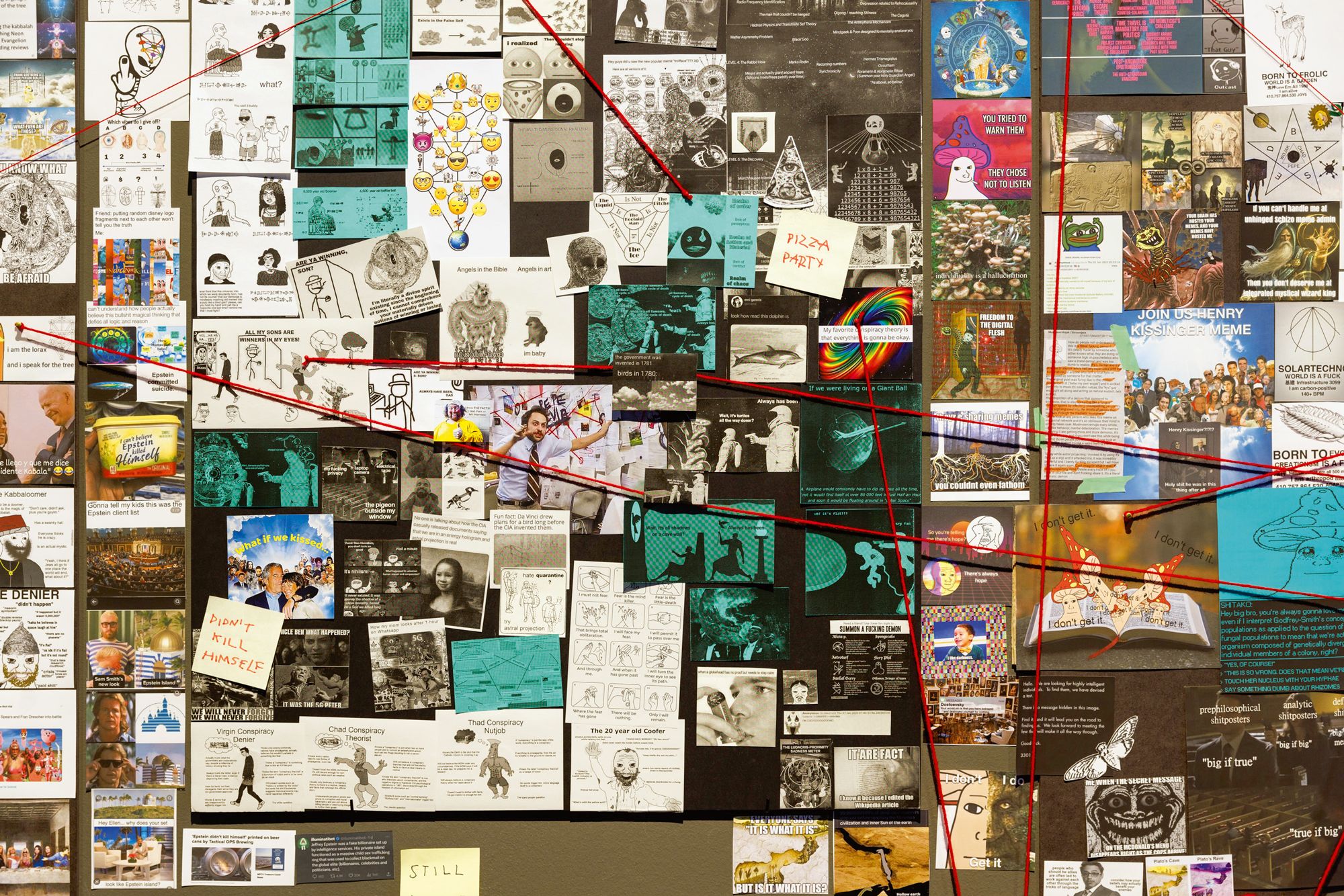 If Crawford and Joler’s map doesn’t flee the terrain of the conspiratorial, but engages it from a politically progressive point of view, one stumbles in the KW stairwell upon a poster installation of diagrams purchased from the website of Dylan Louis Monroe, the “map maker” of the right-wing conspiracy movement QAnon. The wall text mentions that he created the Orit-B Codex, an accelerant of the “Great Awakening,” without elaborating that this refers to the “awakening” of individuals to a racist, misogynistic, or antisemitic worldview. One could argue that such material is yet more cognitive mapping of the impenetrable world that exceeds us; or, it might flirt with the aestheticization of fascism under the guise of research-based art. Other works, like Joshua Citarella’s e-deologies (2020–23), a melange of flags with hyper-specific political labels from online subcultures (“Anarcho-Capitalist Voluntarist Pacifism,” “Left Egoist Trans-humanism,” et al), remind us that the horseshoe theory, which postulates the convergence of opposed political ideologies, often gets taken up as a nihilistic visual cue to flatten distinctions between left and right into baroque names and cutified logos.