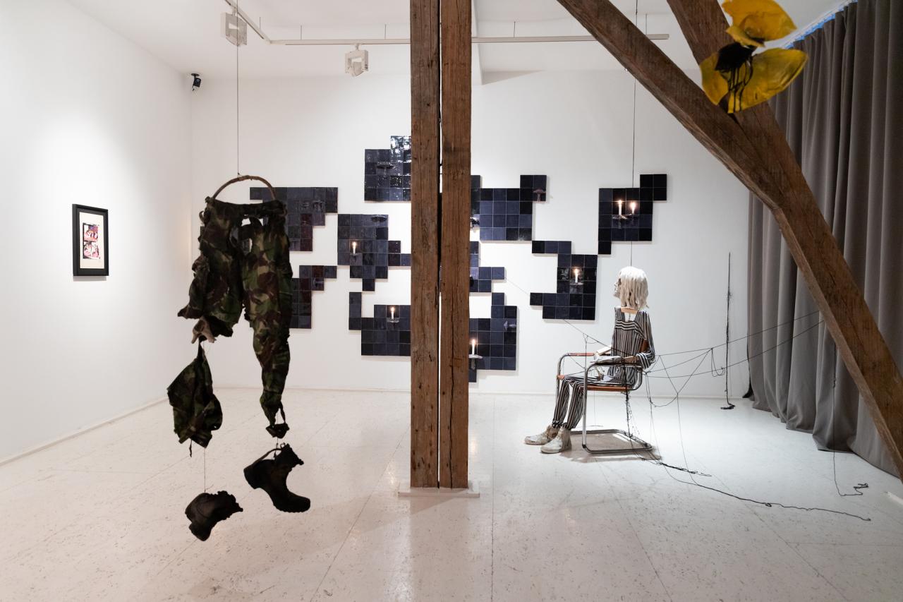While none of the artists featured in this group show ostensibly has anything to do with Naples, they seem to be – the curator, Gigiotto Del Vecchio, certainly does. Cunning and burlesque, dramatic and jocular, the works exude a theatricality that makes the title of the show programmatic: a vision that verges on brutishness. Liz Craft (*1970) has turned the left wall of HUA’s garret into a sort of catacomb, an array of dark blue ceramic tiles spooked by mushrooms candleholders, while a wood and papier-mâché marionette with six eyes sits on a chair and looks at the candles, almost annoyed by the playhouse behind her back. Center stage is Franziska Lantz’s (*1975) installation, all debris found on the banks of the Thames – animal bones, clay pipes, a motorcycle helmet, military jackets, the fragments concocted into dreamcatchers or skeleton puppets. All the while Augustin Katz’s (*1995) satyr, in Boneshaker (2022), sneers at them in a blood-red ecstasy.