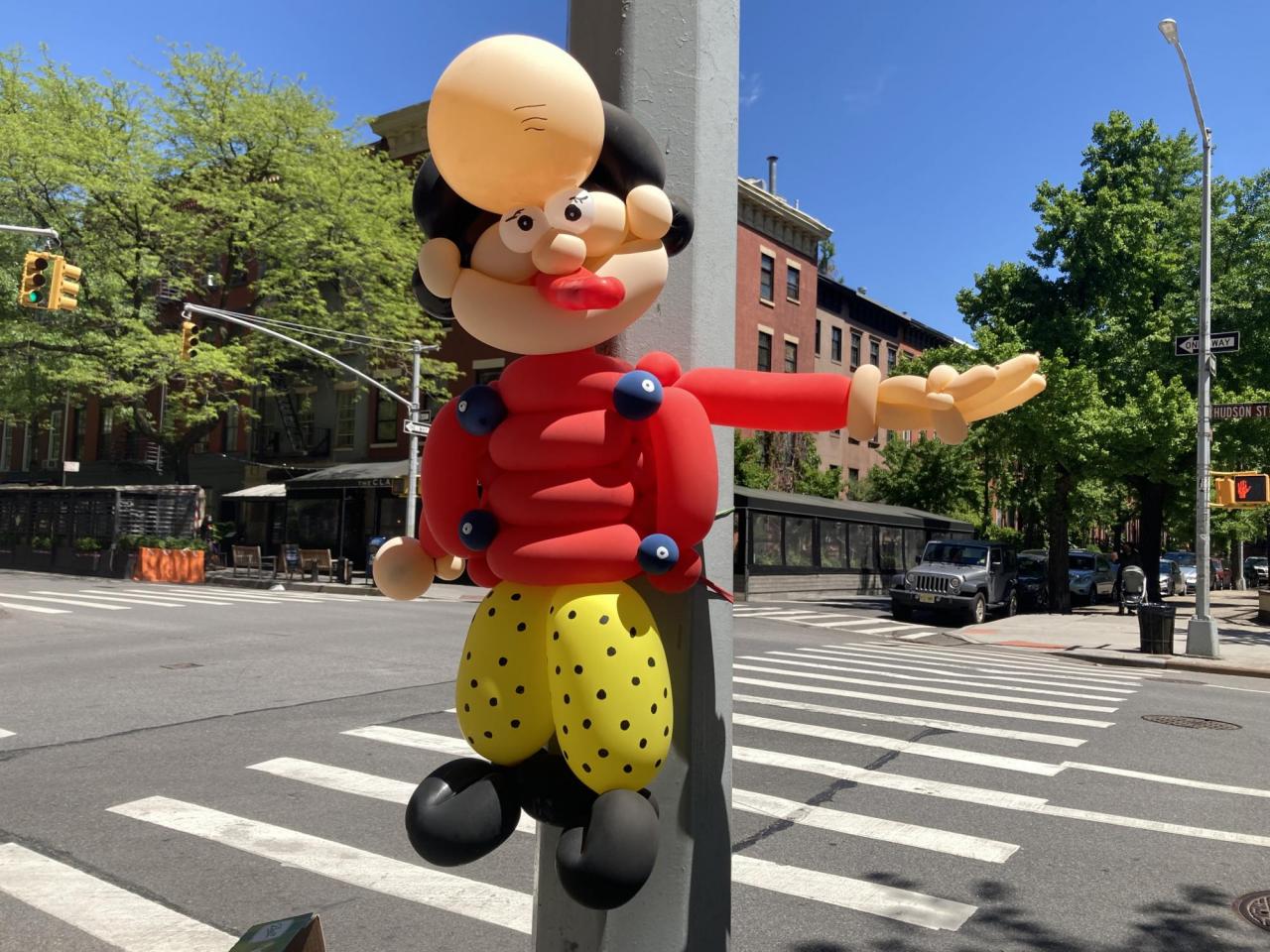 Installation by Simon Deschamps in the windows of Cooper Union, Cooper Square, May 2021