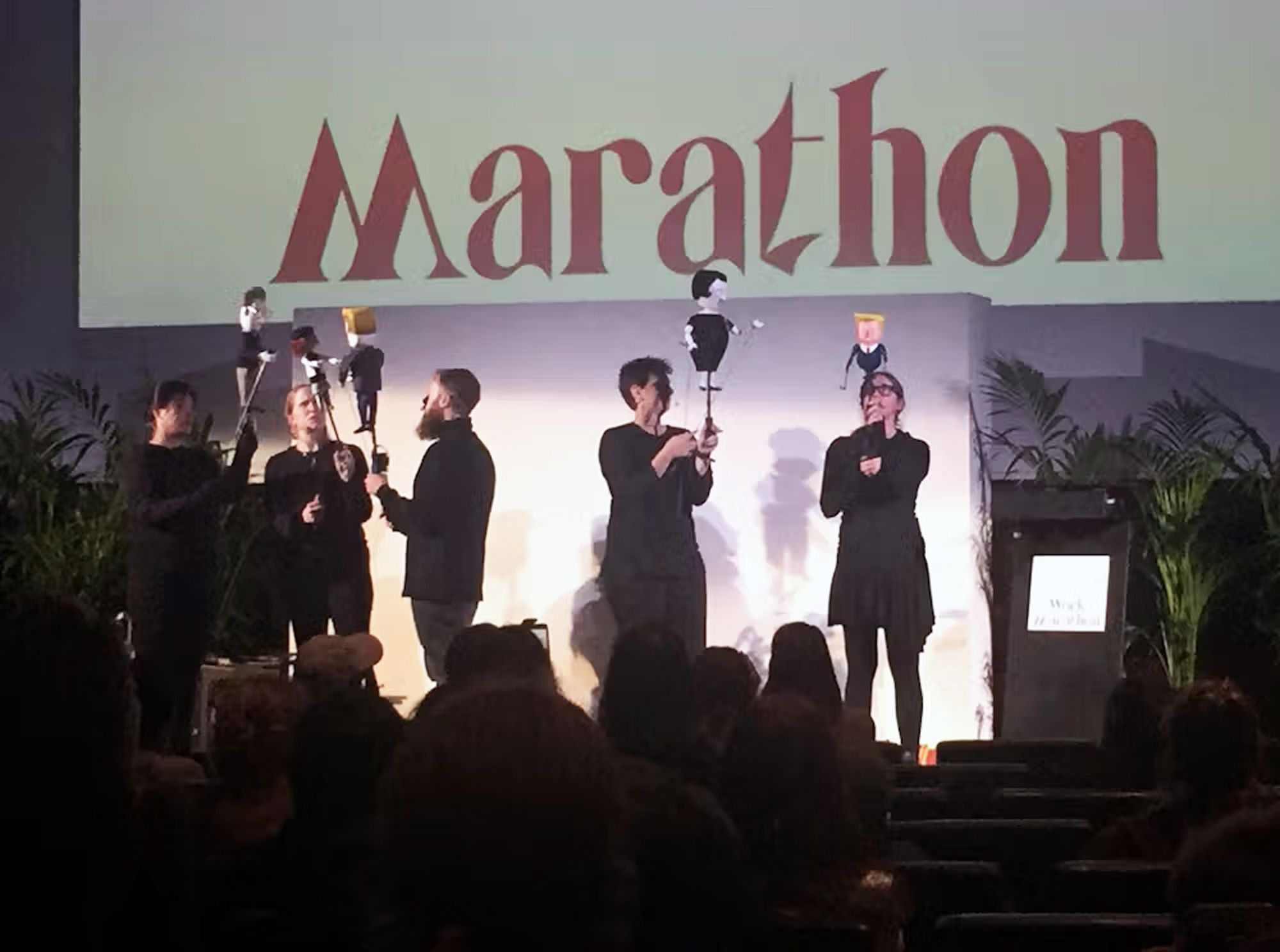 15:37 Totally unbearable puppets manned by XL personality theatre kid people in black. I squirm in my seat and watch as far too much emotion twists the faces of these strangers like balloon animals. Puppet shows are grotesque and frightening and should be banned for obvious reasons but then I remember I chose this journey and must forgive the creatures I find within its depths. Perhaps I’m just jealous because I bury my own considerable emotions in deep depths too. Anyway Marx jumps out of a hammer and sickle cake and and a musical bit says we’re all slaves which is fair.