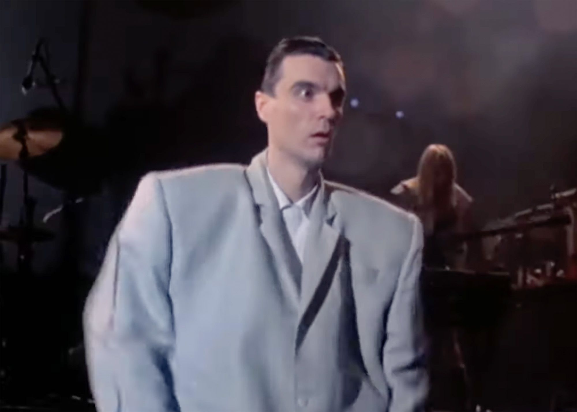 Left: David Byrne’s Stop Making Sense Big Suit Tour (1984); right: Raey’s “giant” suit (current season)