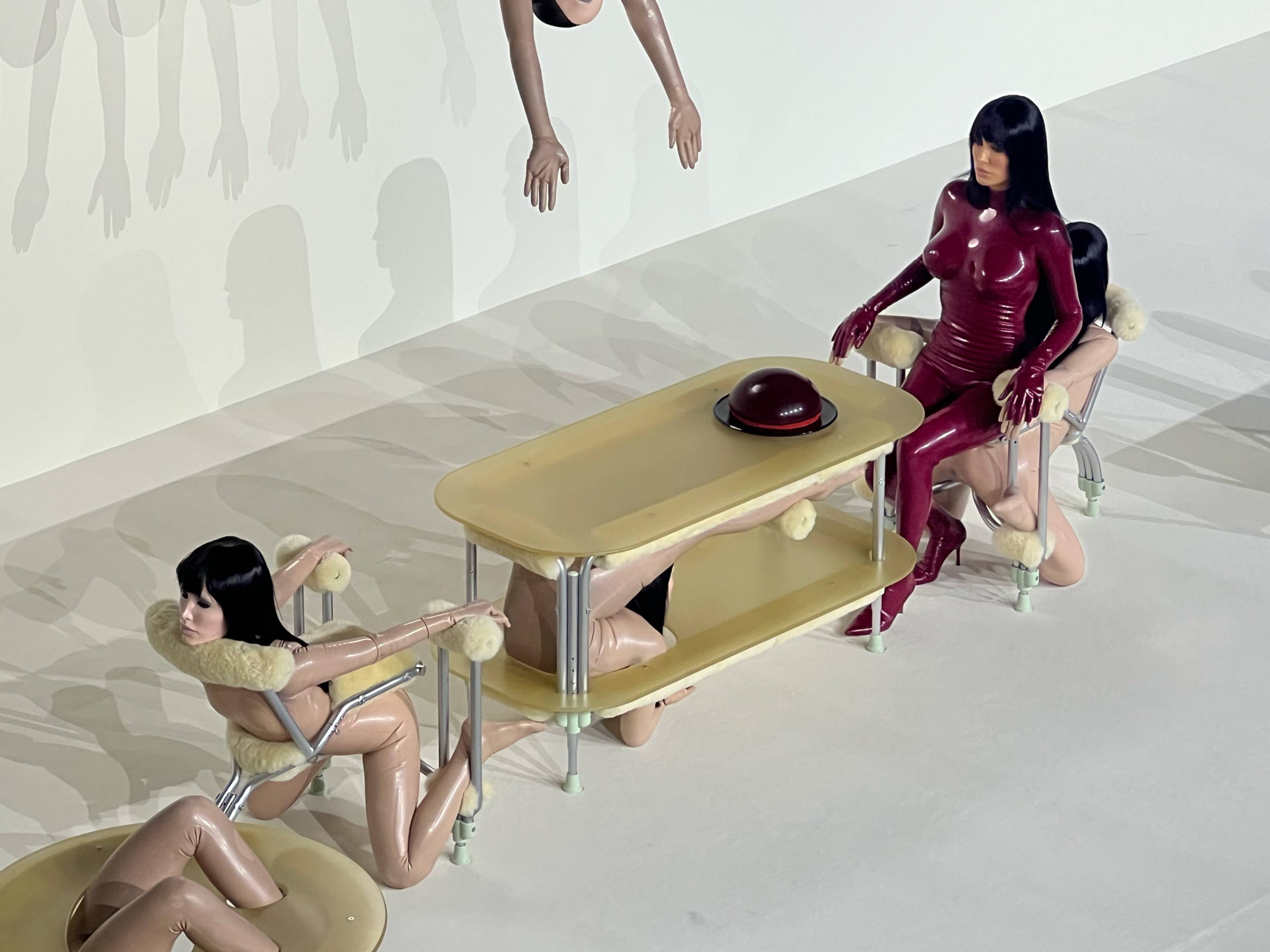 Its first installment, “SERIES 01: THE ORIGIN,” opens on Censori standing in a kitchen of sleek stainless steel, clad in skintight red latex, from turtleneck to pointed toe. But really, it opens before that, as she descends from a catwalk at the rear of the venue, trailed by mother, sister, and Ye. The artist is present, preparing a “cake” – really, a gelatinous oxblood dome – her face frozen in an expression of Stepford Wife placidity. After the concoction comes together, she wheels it away on a bar cart as the wordless, orchestral musical score (a new composition by Ye) is pierced by a scream. White, floor-to-ceiling curtains part to reveal a space-age living room, its coffee table, armchairs, sideboard, and chandelier all made of bent chrome – legs resembling medical crutches – with the bodies of contorted Censori-clones restrained by the furniture’s bends. The doubles wear wigs of her hair and masks of her face, their forms hugged by nude bodysuits designed by Kido Shigenari, aka Kurage, a Japanese fashion designer specializing in – what else – latex. From Censori’s entrance to the clone-furniture’s big reveal, the whole endeavor lasted about fifteen minutes.